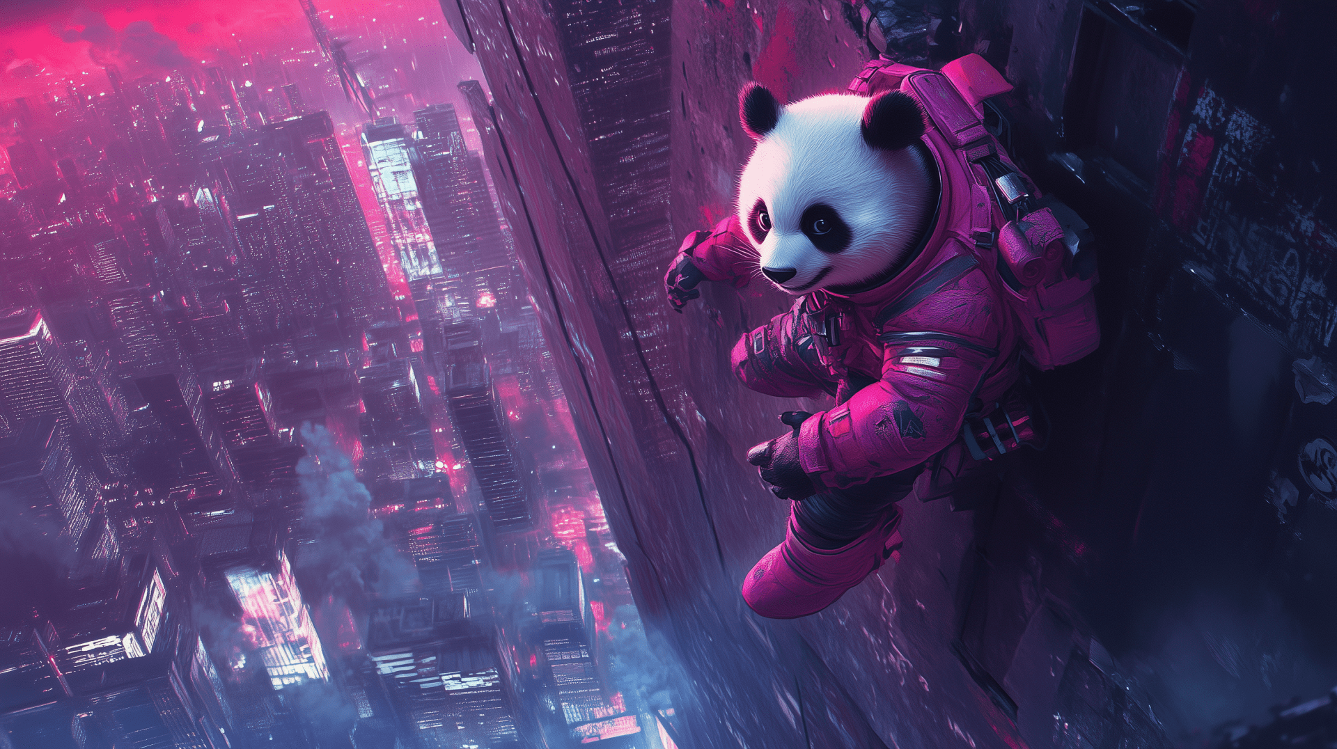 The image features a panda in a pink spacesuit, sporting a determined expression and visible battle scars. It is scaling a towering obsidian pyramid within a dark atmospheric cyberpunk cityscape, evoking a sense of adventure and resilience.