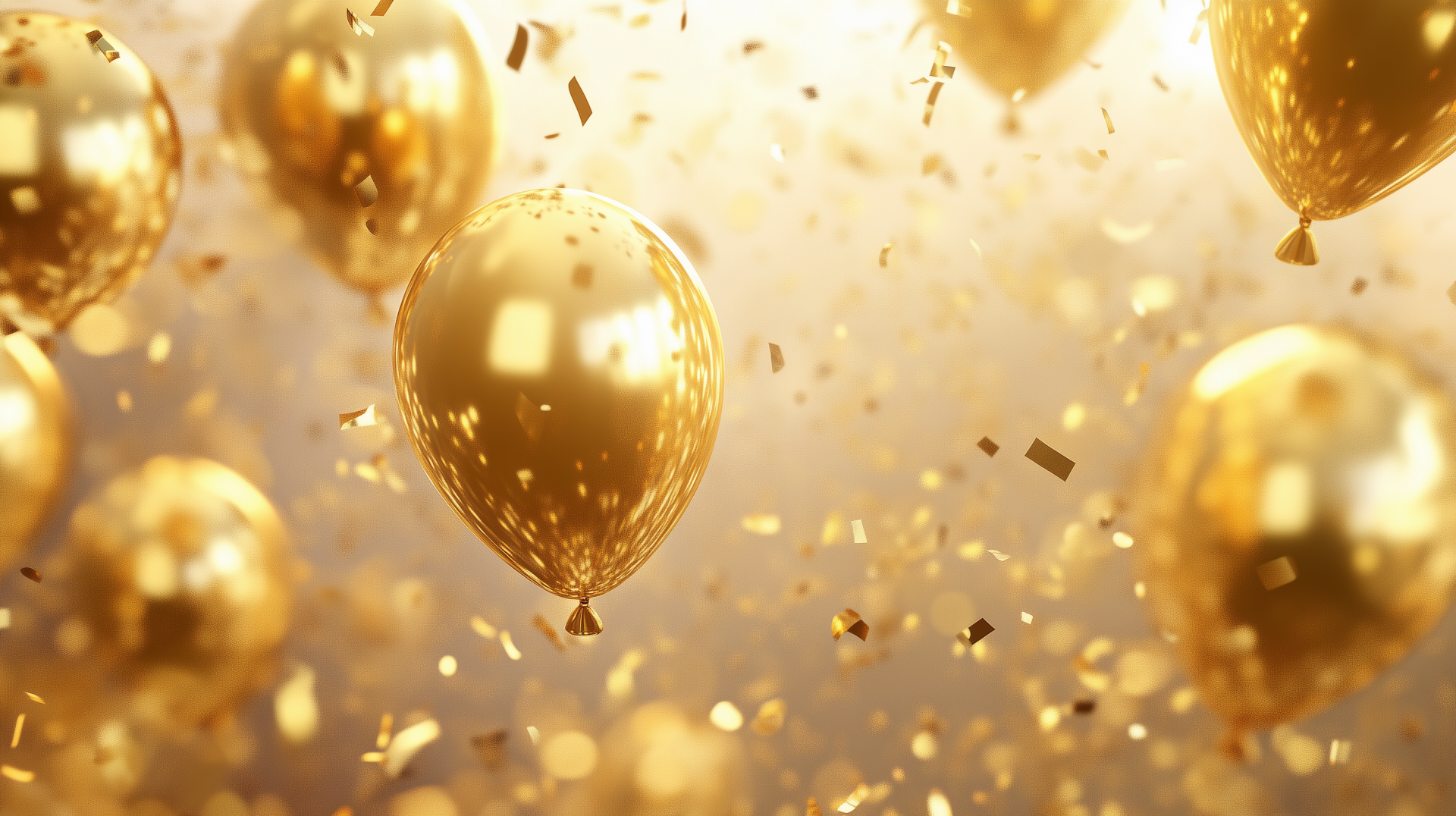 The image features vibrant 3D graphics showcasing golden balloons surrounded by shimmering confetti and particles. The overall composition creates a festive and celebratory atmosphere, with a focus on the rich golden hues.