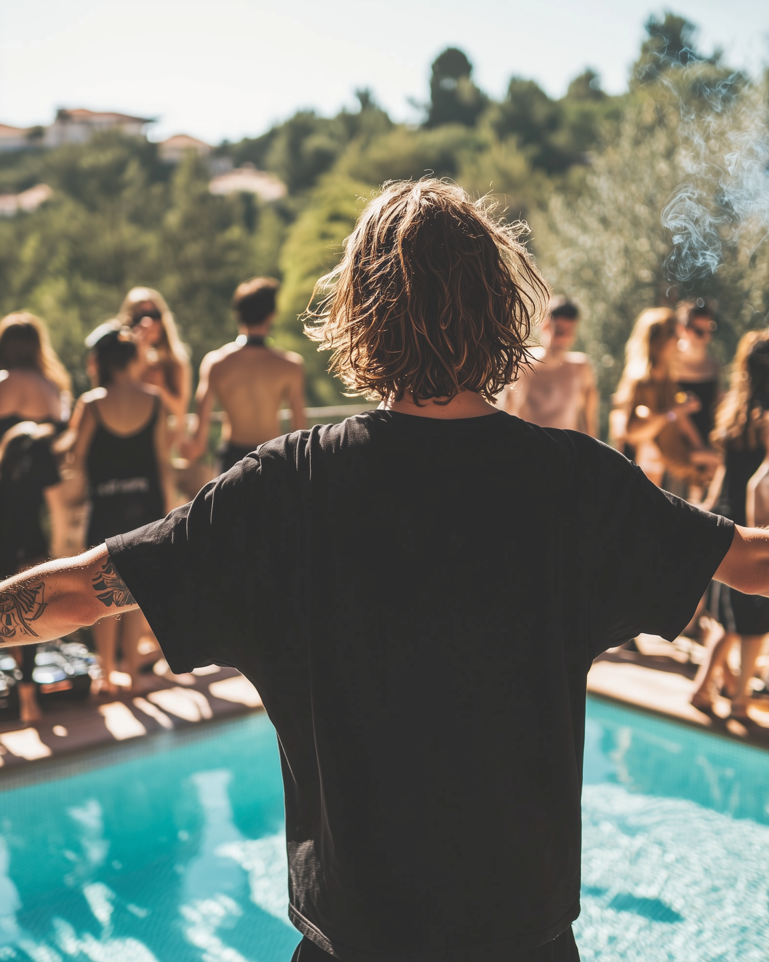 This photo captures a vibrant outdoor pool party atmosphere filled with sunlight and energy. A DJ with bushy hair stretches out his arms, creating a lively scene among friends enjoying the fun.
