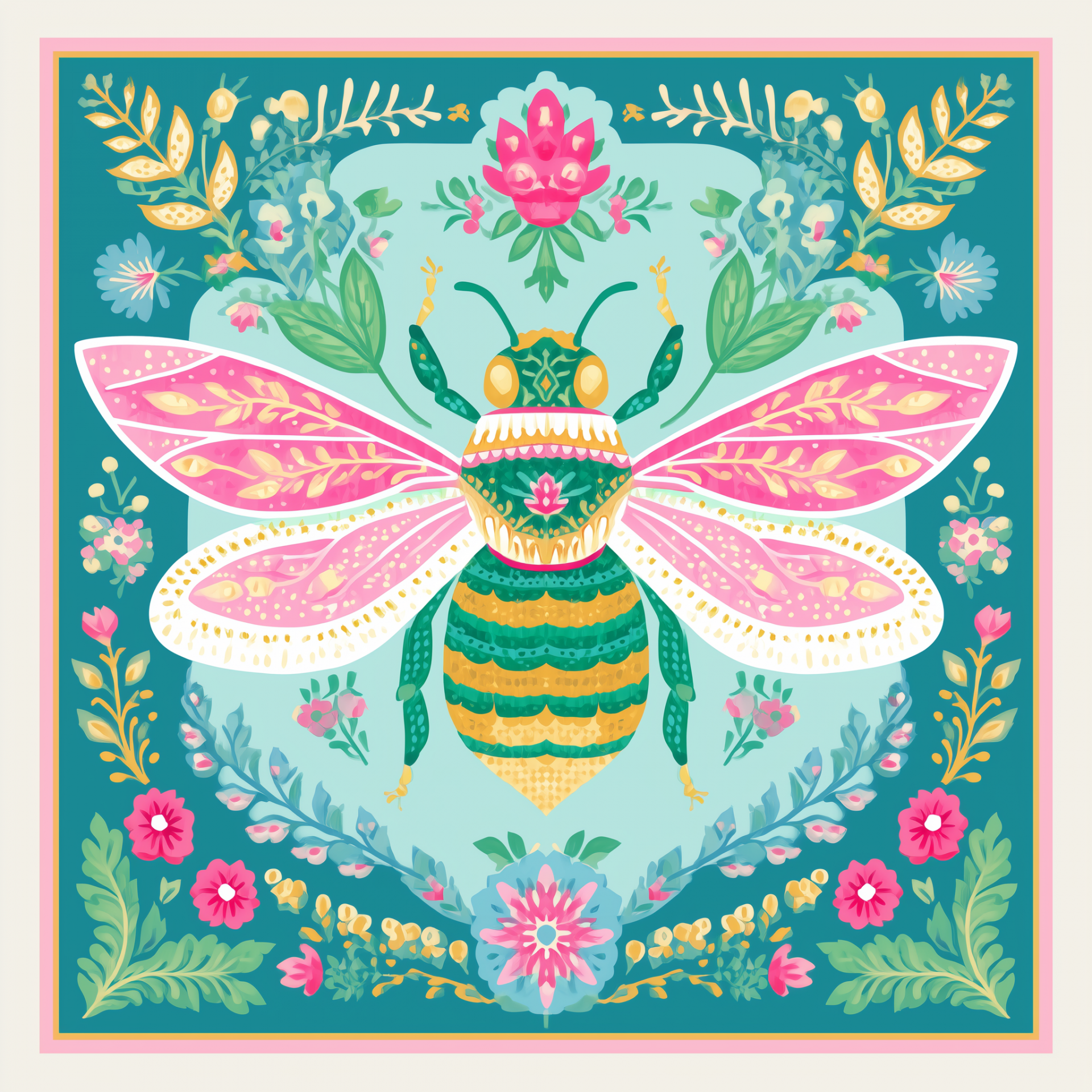 This illustration showcases a charming folk art style with an abstract depiction of a bee. The pastel pink and green tones contrast beautifully against the light blue background, creating a calming and whimsical effect.