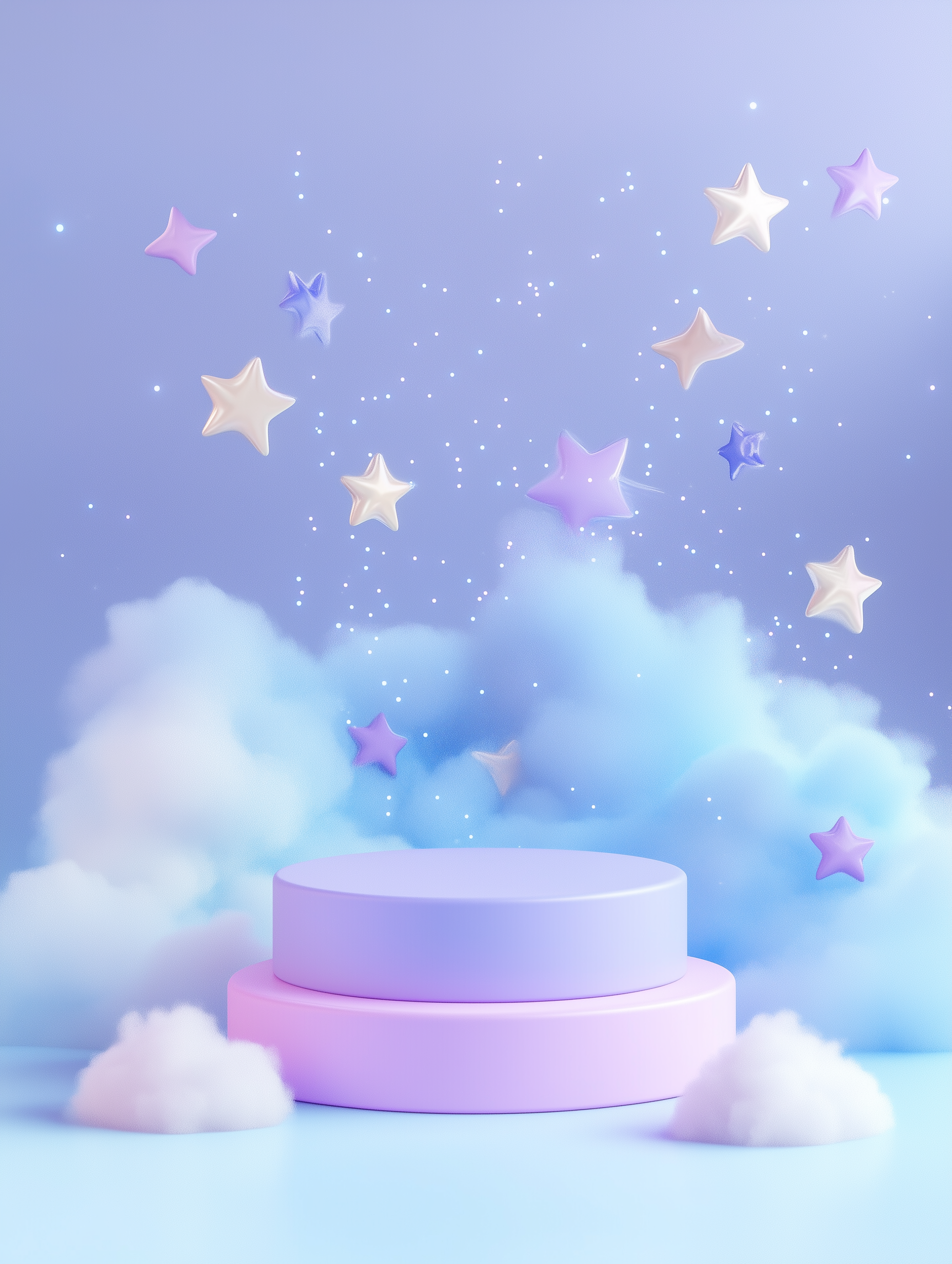 This image features a whimsical podium surrounded by floating stars and clouds. The color palette includes soft light blue and purple shades, creating a serene and minimalistic atmosphere.