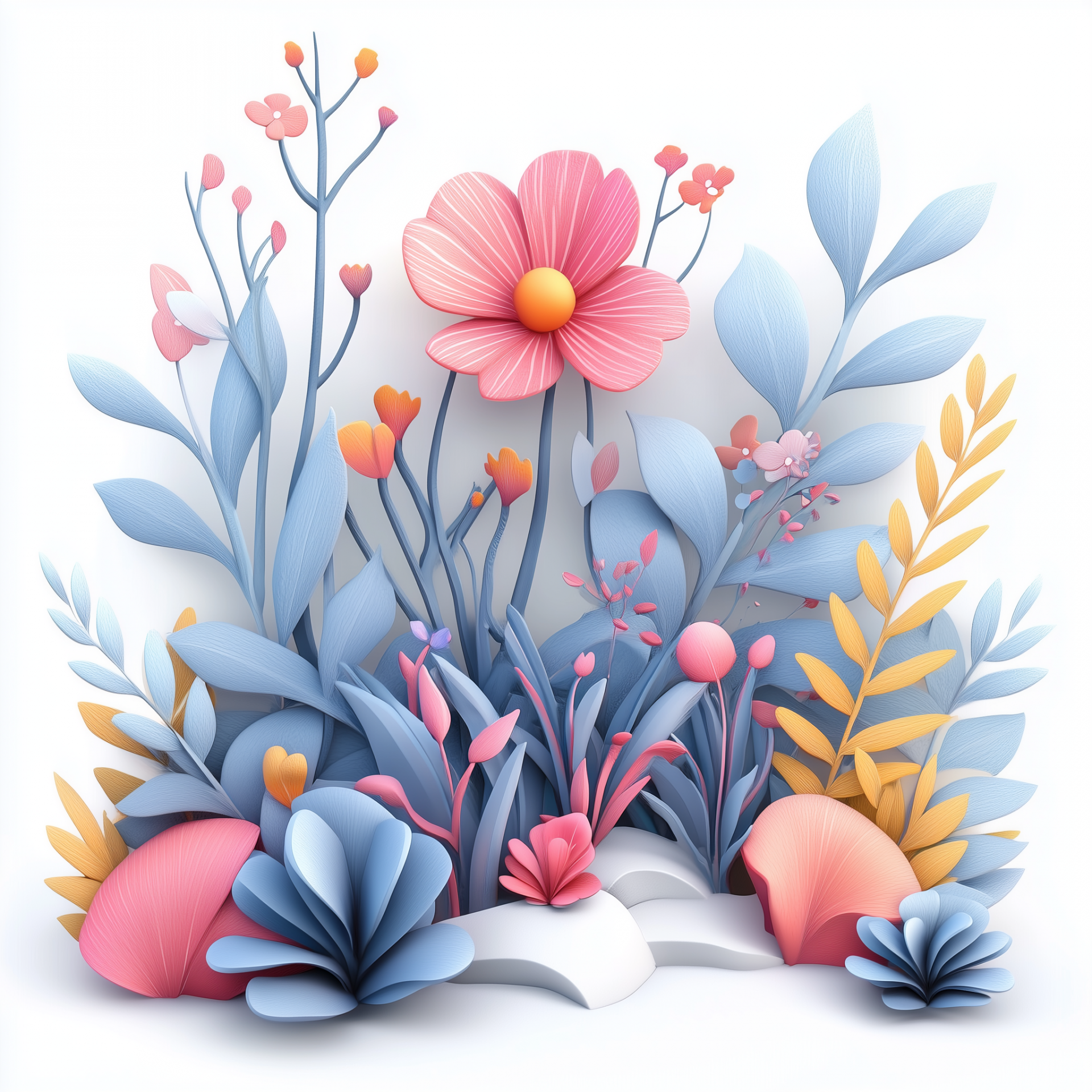 This image showcases a collection of 3D rendered plants, bushes, and flowers placed against a clean white background. The pastel colors and paper art style create a soft, serene atmosphere.