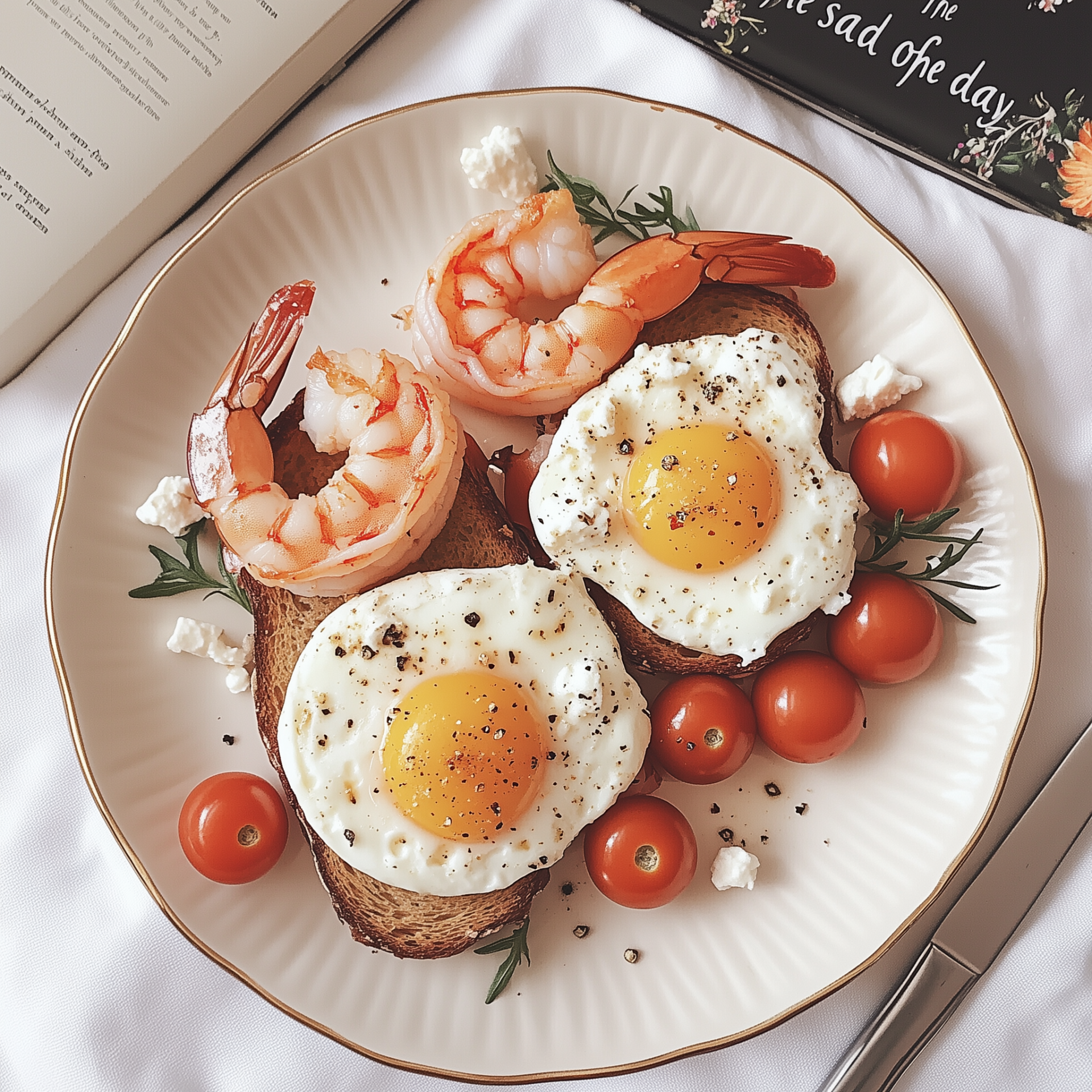The image showcases a beautifully arranged plate of toast topped with shrimps, eggs, and mozzarella, complemented by cherry tomatoes and feta cheese. Set against a white tablecloth, the color palette offers a soft, pastel aesthetic that evokes a sense of elegance and sophistication.