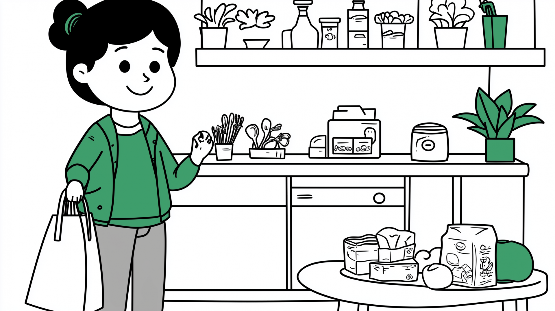 This image captures a warm and inviting kitchen scene filled with soft pastel tones. A young woman stands by an open pantry, exuding a cheerful atmosphere while surrounded by various kitchen accessories and plants.