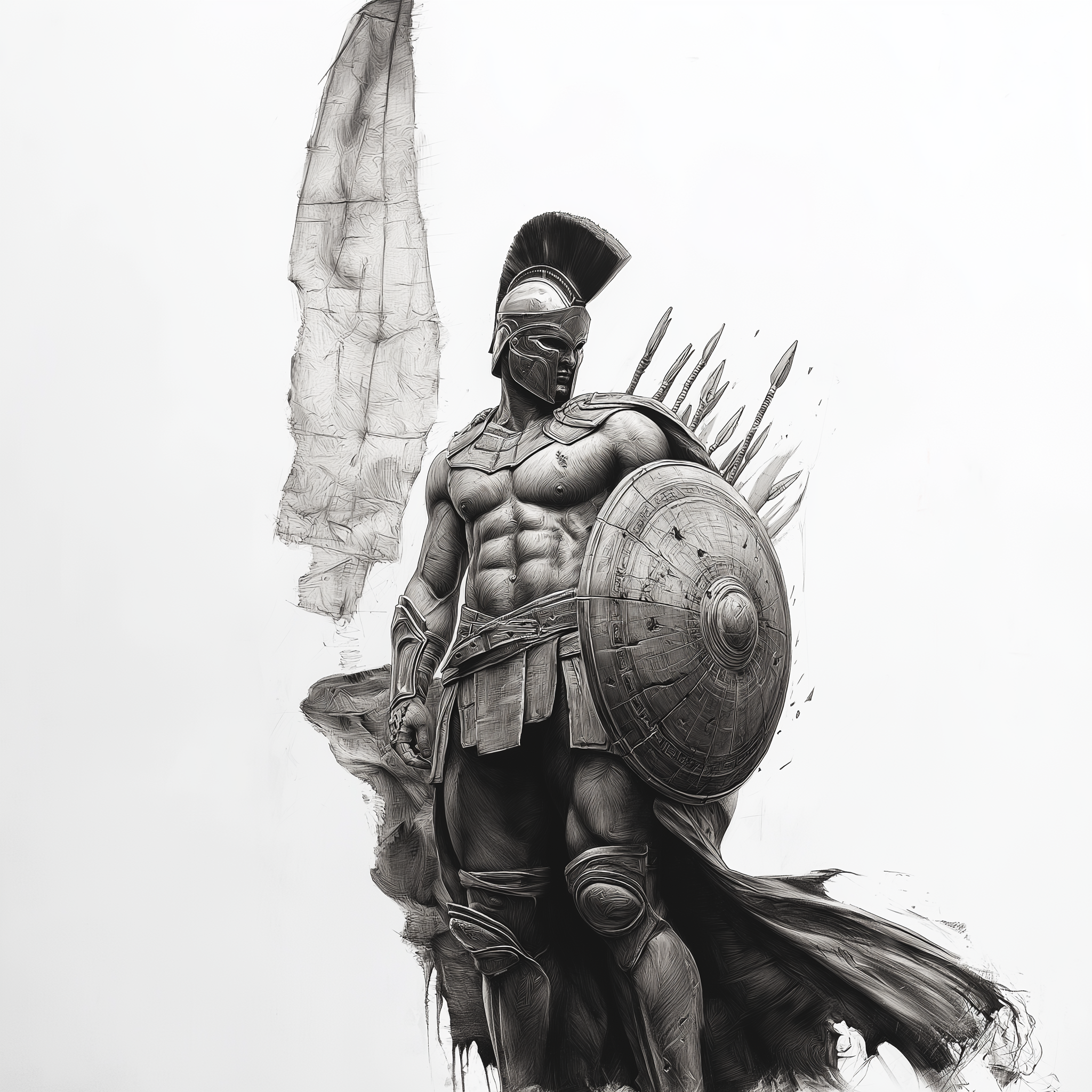 This illustration features a Spartan soldier depicted in a striking black and grey pencil art style. The detailed hyper-realistic rendering showcases the soldier's armor, shield, and spear, emphasizing clean lines and a captivating sense of strength.