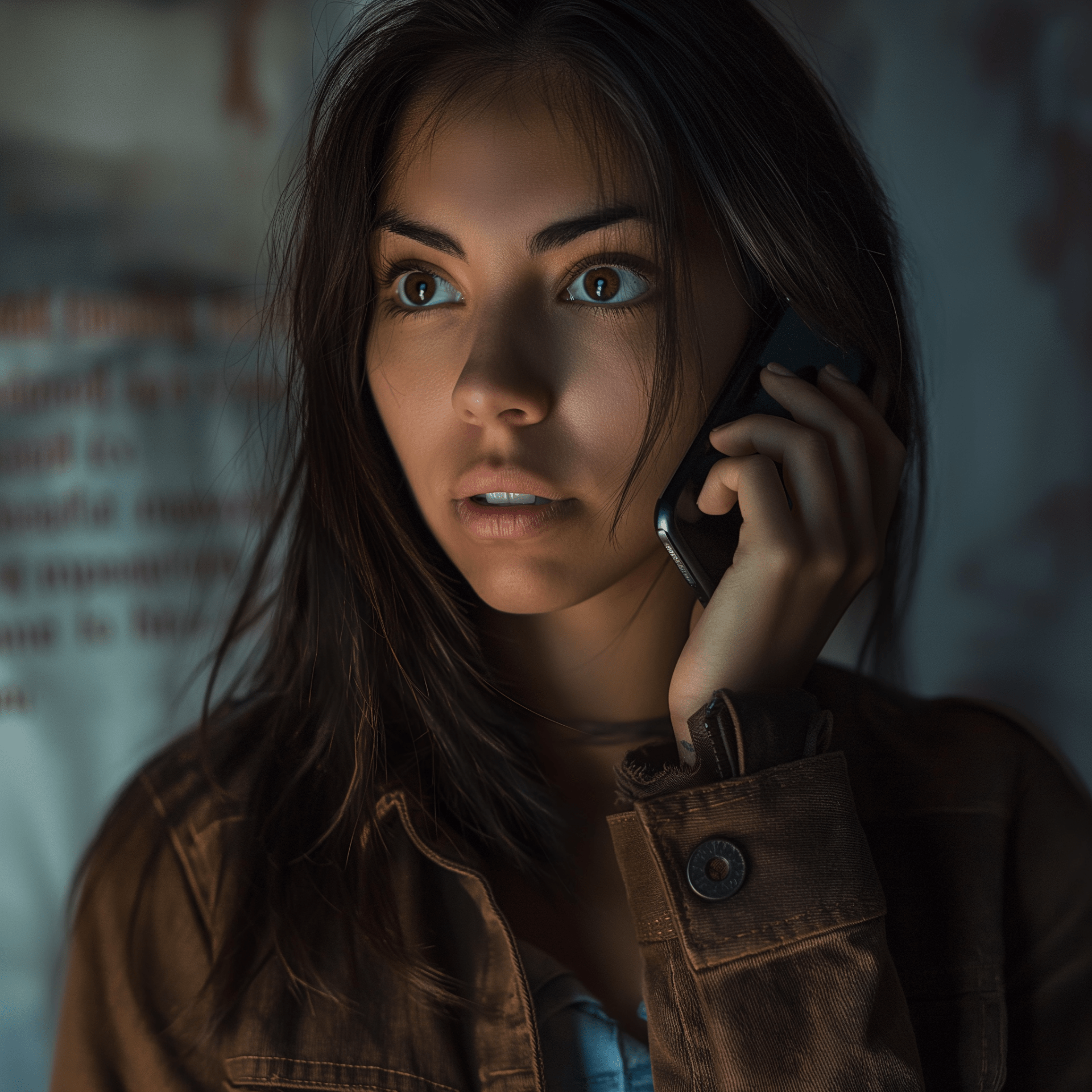 The image features a woman in her 30s engaged in an animated conversation on her cell phone. Her close-up shot highlights her expressions and the vibrant atmosphere around her.