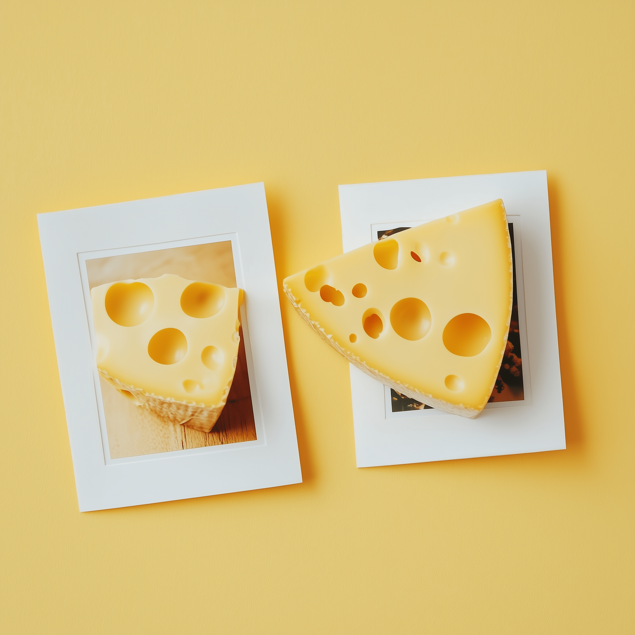 This image features two polaroid photos displayed against a warm cheese-colored background. The vibrant contrast creates a nostalgic and artistic feel, inviting viewers to explore the captured moments.