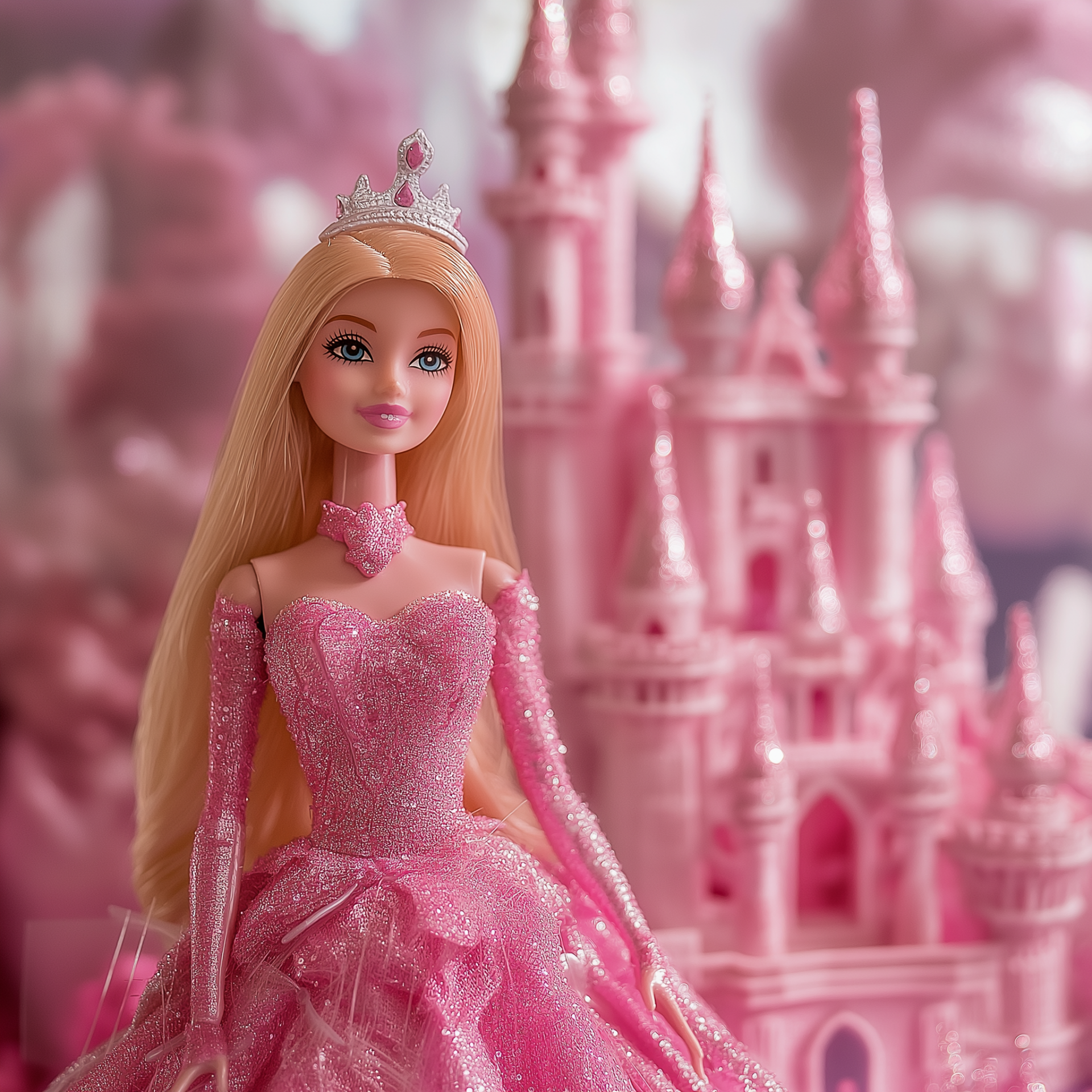 This image features a vibrant Barbie figure set against a whimsical pink castle backdrop. The overall aesthetic is girly and glittery, evoking a sense of fantasy and charm.