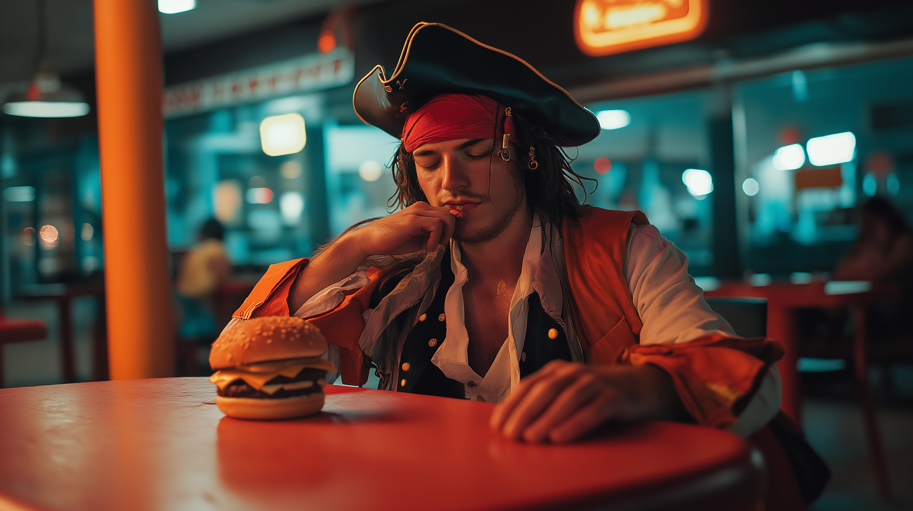 The image captures a young man in a homemade pirate costume, embodying a relaxed vibe as he enjoys his burger. The setting is a dimly lit Burger King, adding to the late-night atmosphere.