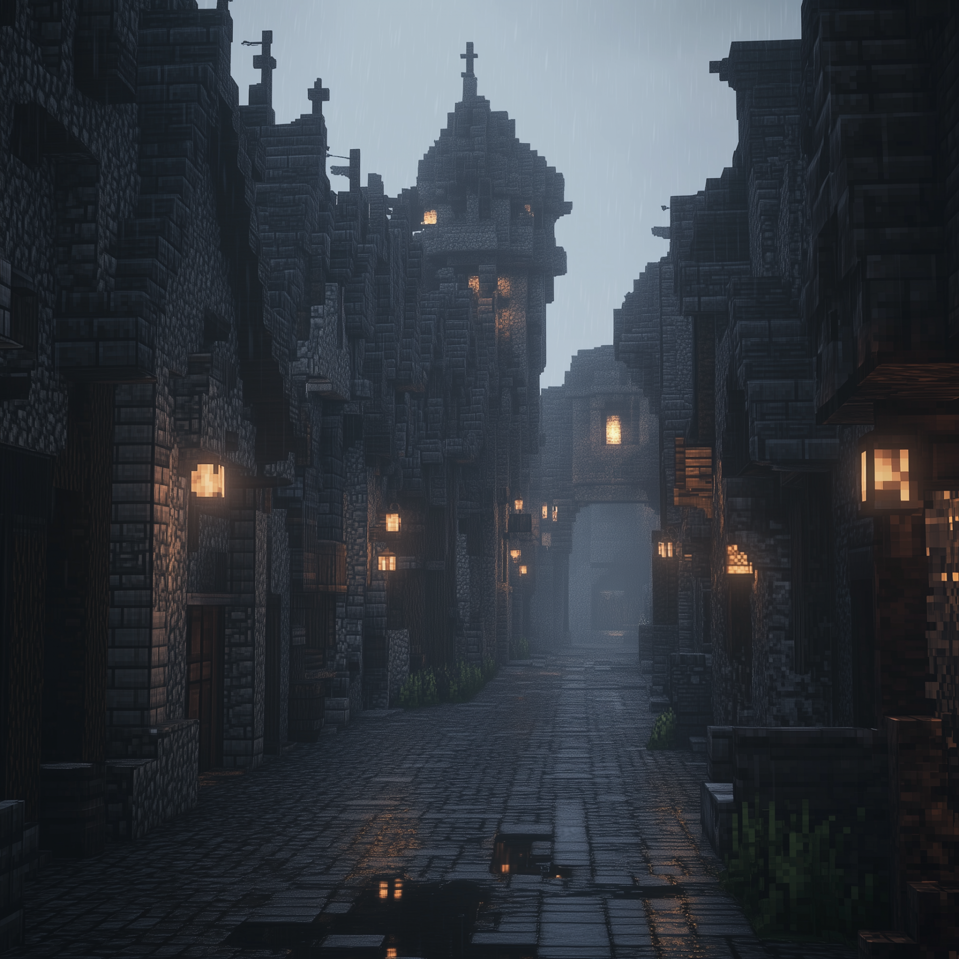 The image depicts a dark alleyway set in a Minecraft-inspired world, featuring intricately designed gothic buildings on either side. The atmosphere is moody and mysterious, with shadowy corners and pixelated textures that enhance the enchanting feel of the scene.