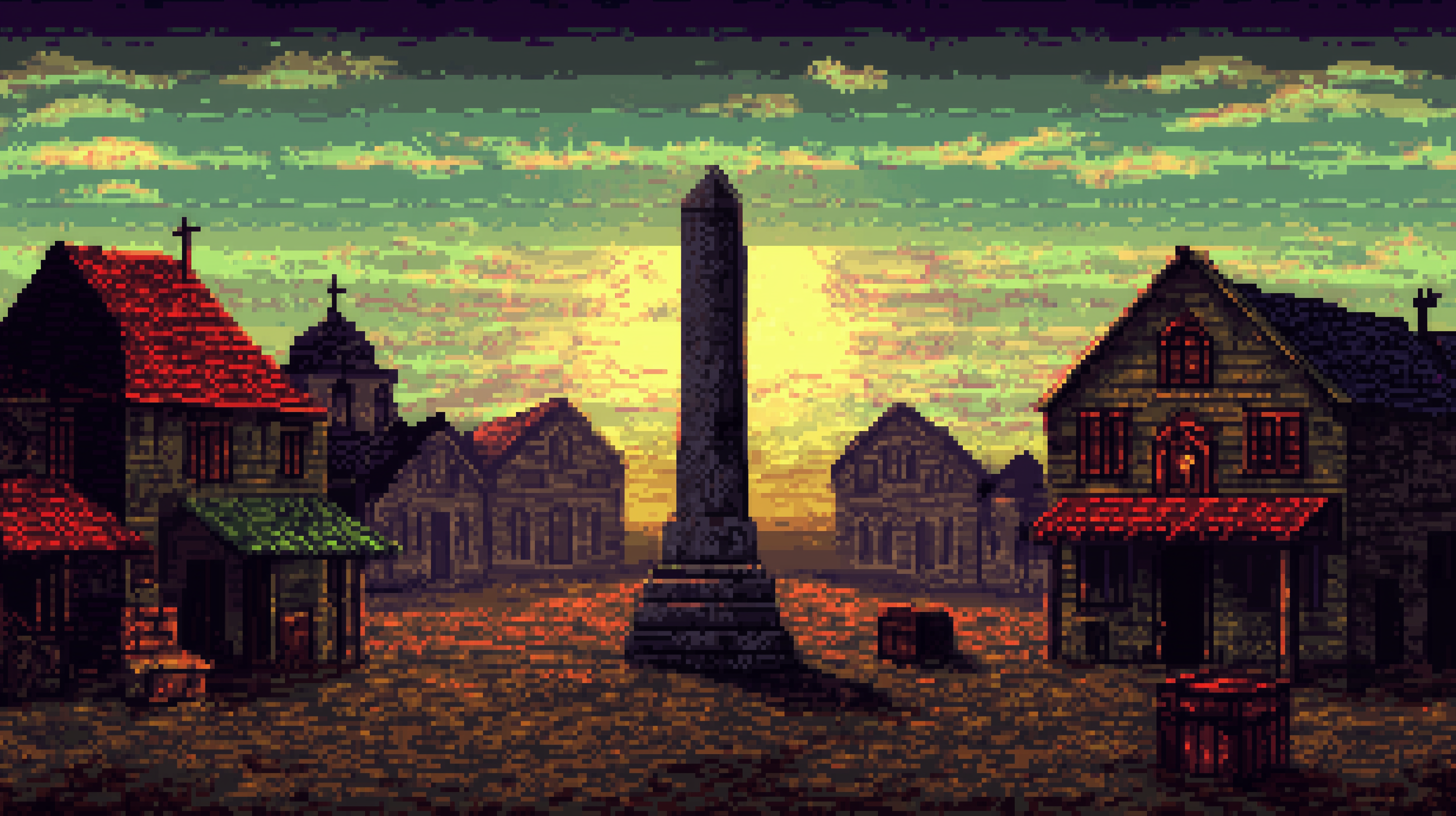 This illustration depicts a serene and deserted town, characterized by its pixel art style reminiscent of classic 16-bit games. In the center, a prominent monument stands alongside a church-like building and a vendor structure, adding to the nostalgic charm of the scene.