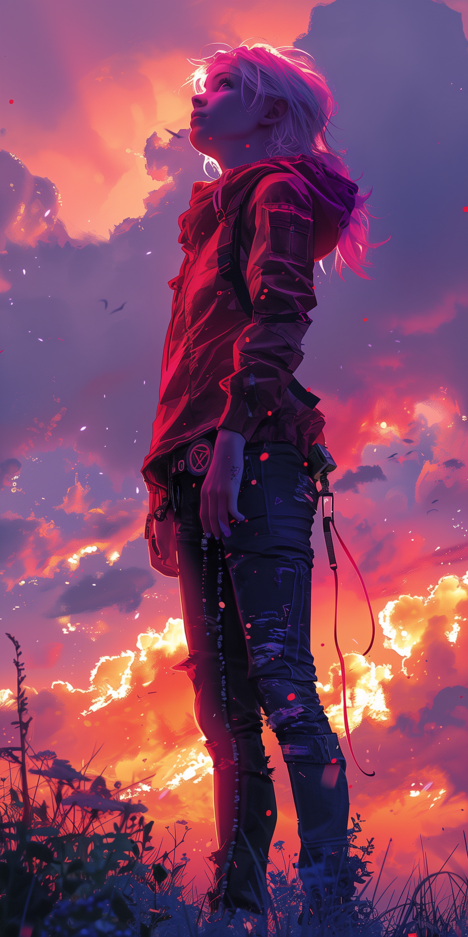 This semi-realistic manga-inspired illustration showcases a full-body portrait of an albino bubblegum punk teen with a pixie appearance. The character has a mischievous expression, tied in a tight ponytail, set against a backlit multicolored pearlescent smokey glow background.