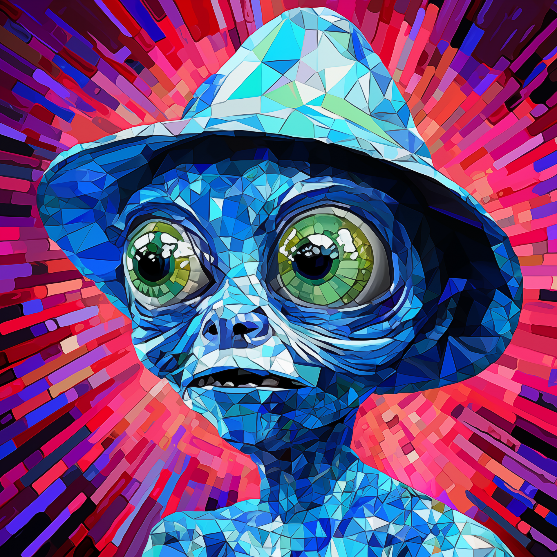 The image features a cartoon blue alien character wearing a shiny silver cone-shaped tinfoil hat. Its vibrant colors and exaggerated features create a playful and whimsical atmosphere, accented by a blue beam laser light in the background.