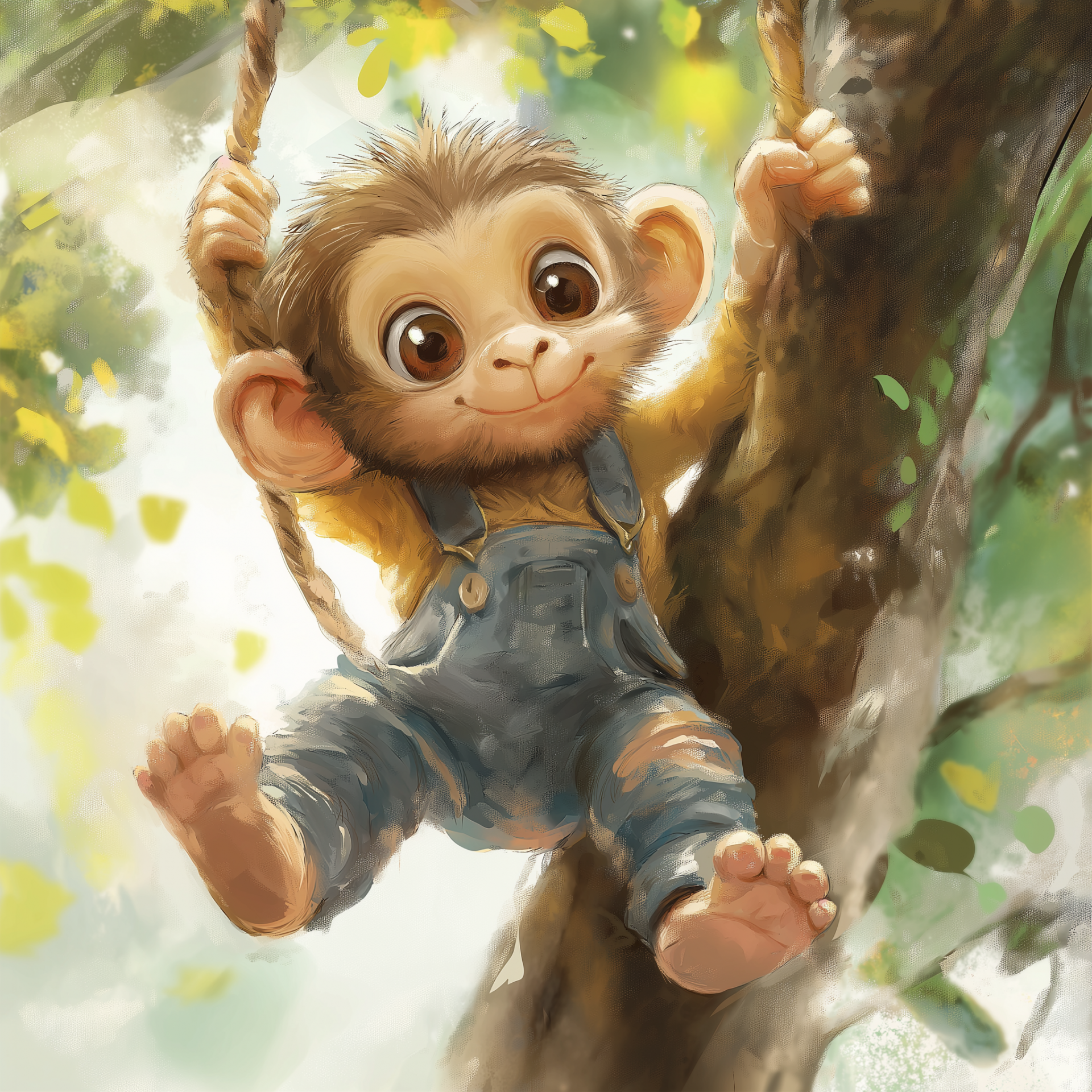 The image features an adorable monkey wearing overalls, playfully swinging from tree branches. The vibrant colors and dynamic pose evoke a sense of joy and liveliness in a natural setting.