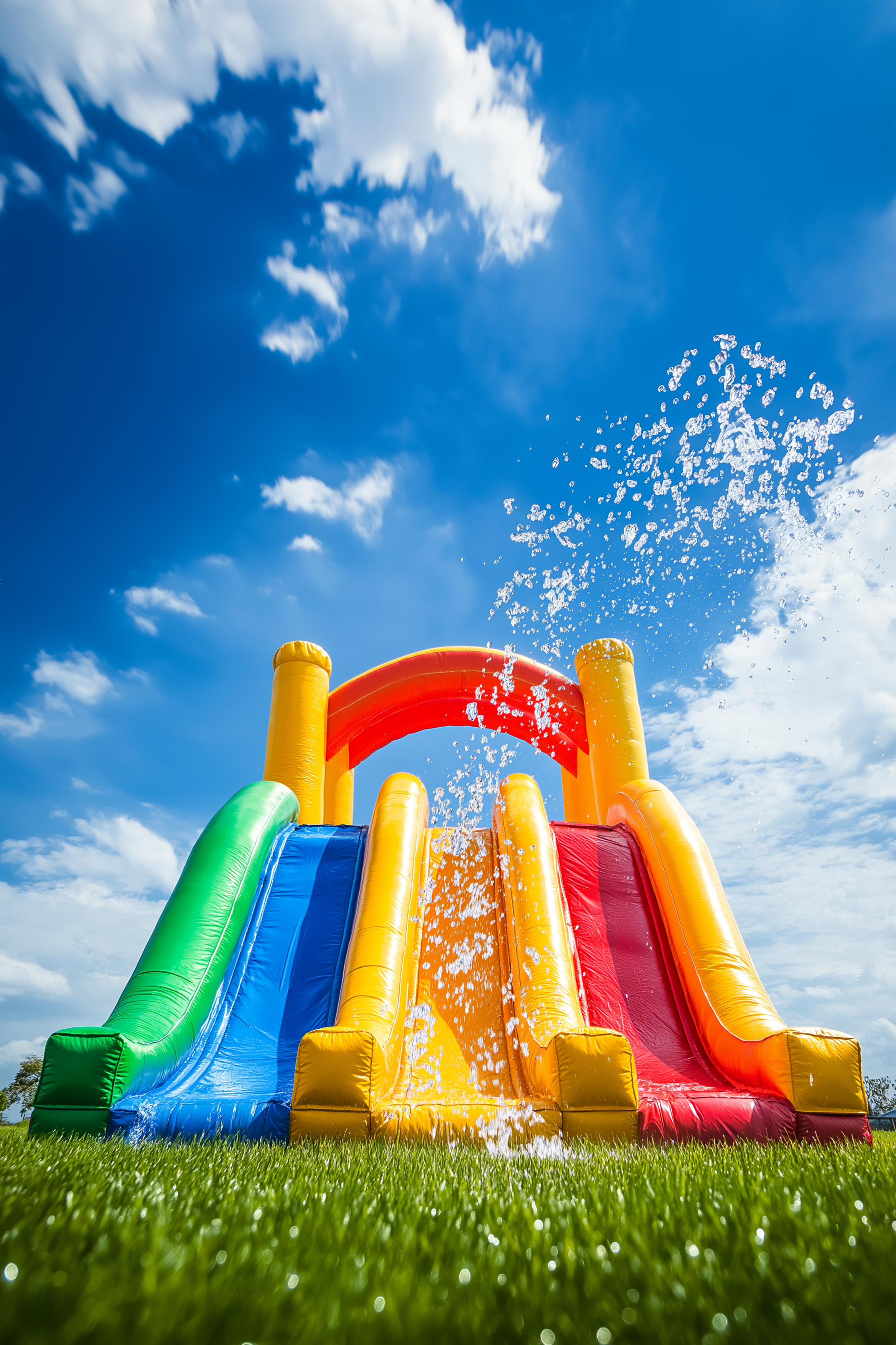 The image showcases a vibrant jumping castle with large slides, set against a lush green grass background. Water splashes are visible around the castle, creating a playful and fun atmosphere.