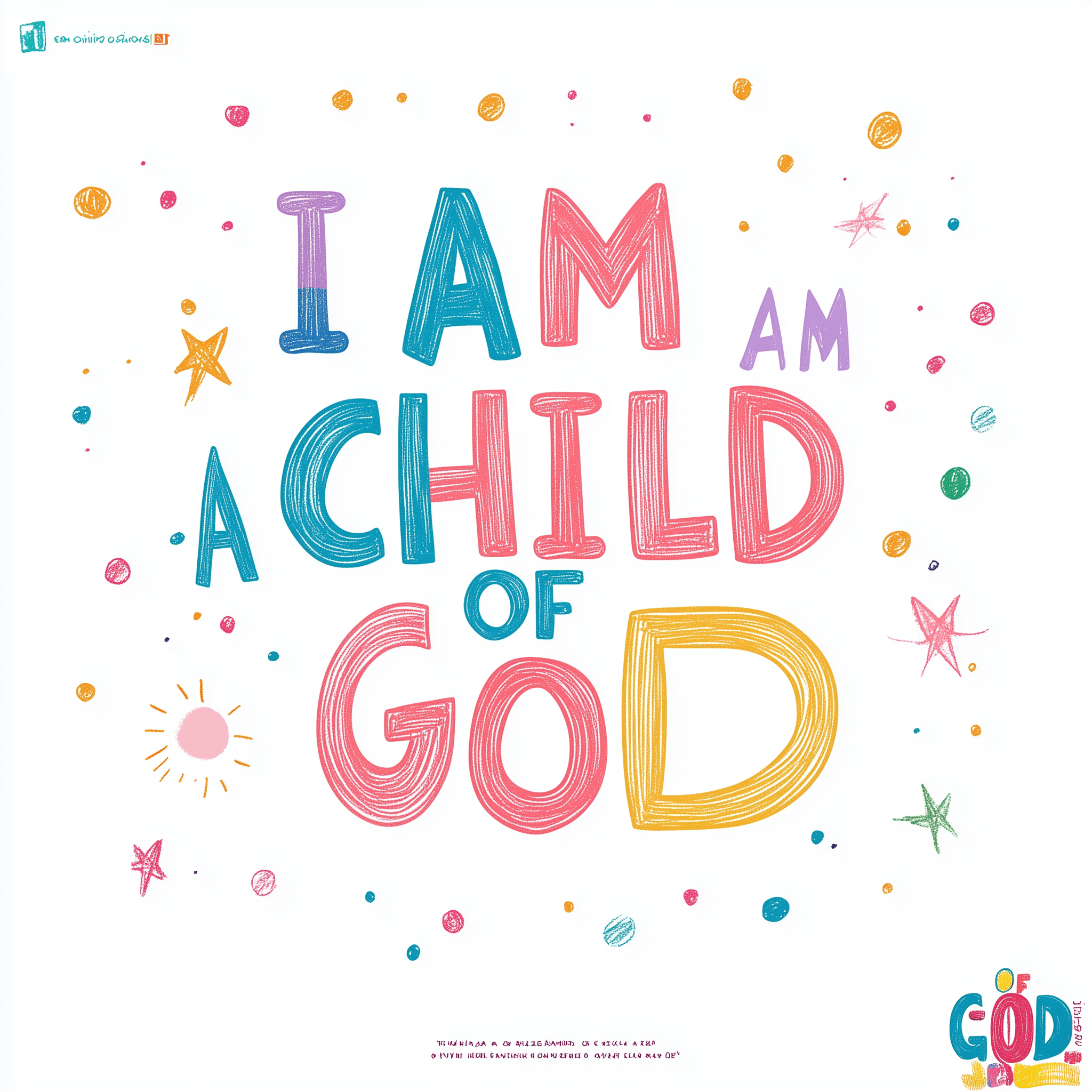 The image features a playful and colorful text that proclaims 'I AM A CHILD OF GOD'. The pastel colors and childlike font create a lighthearted and joyful atmosphere against a blank white background.