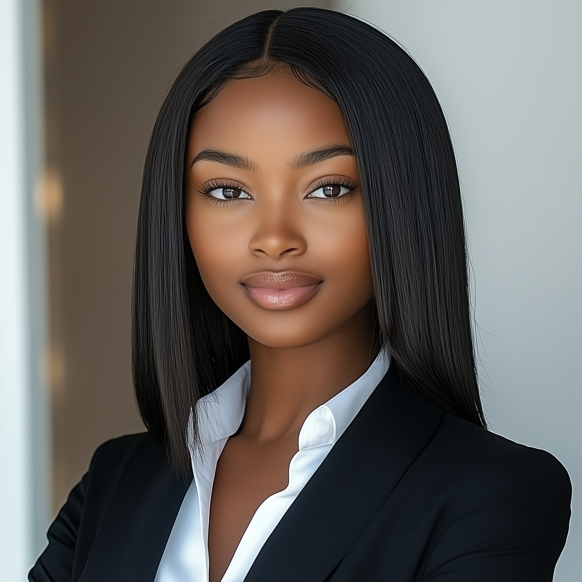 This photo captures a confident Black businesswoman with straight hair, exuding professionalism and poise. The setting highlights her strong demeanor, making her the focal point of the image.