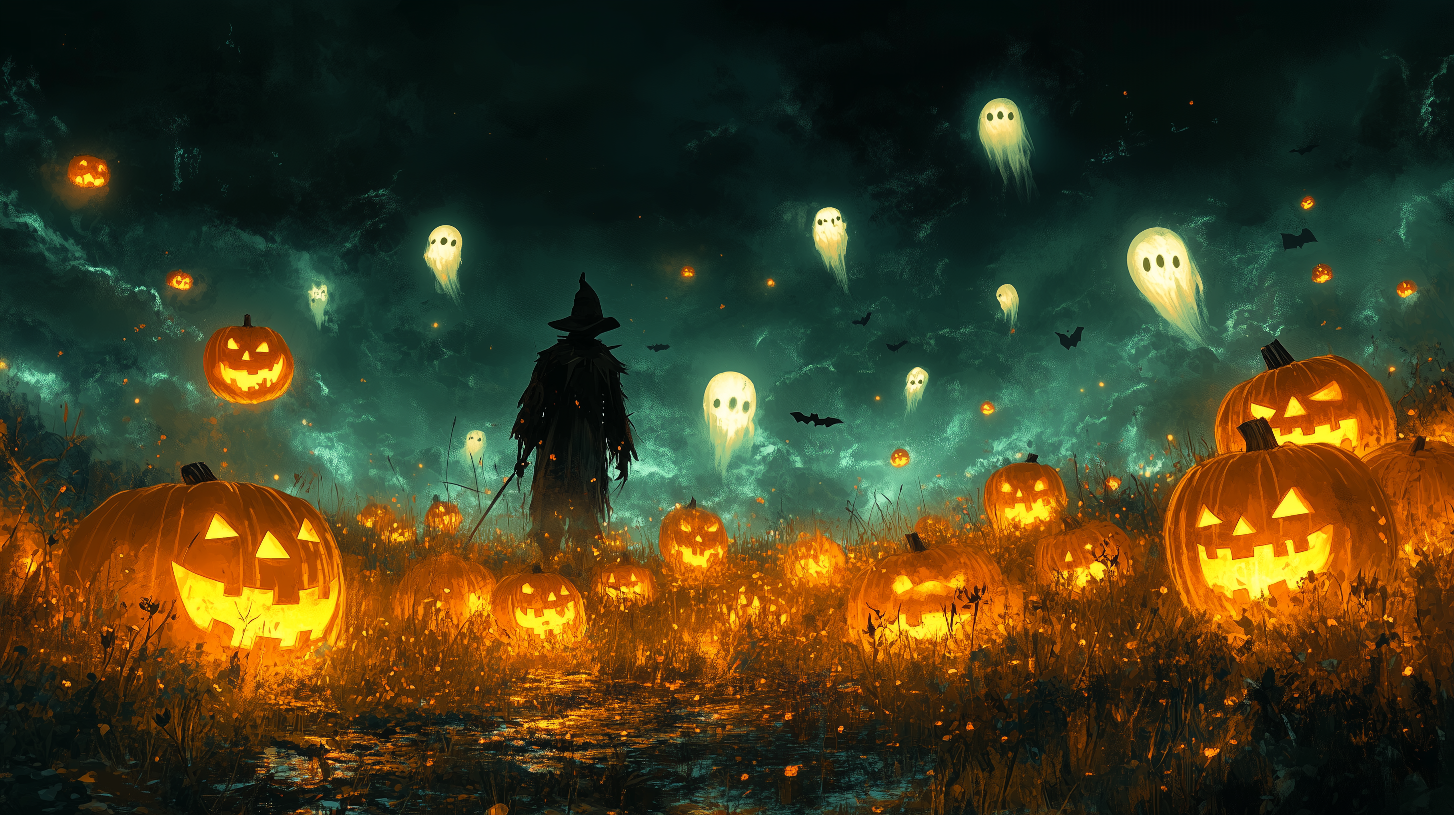 This illustration depicts a spooky field filled with Jack o'lanterns under a dark night sky. The scene is enhanced by a scarecrow, hovering bats, and ghostly figures, all set in a highly detailed dark fantasy cartoon style.