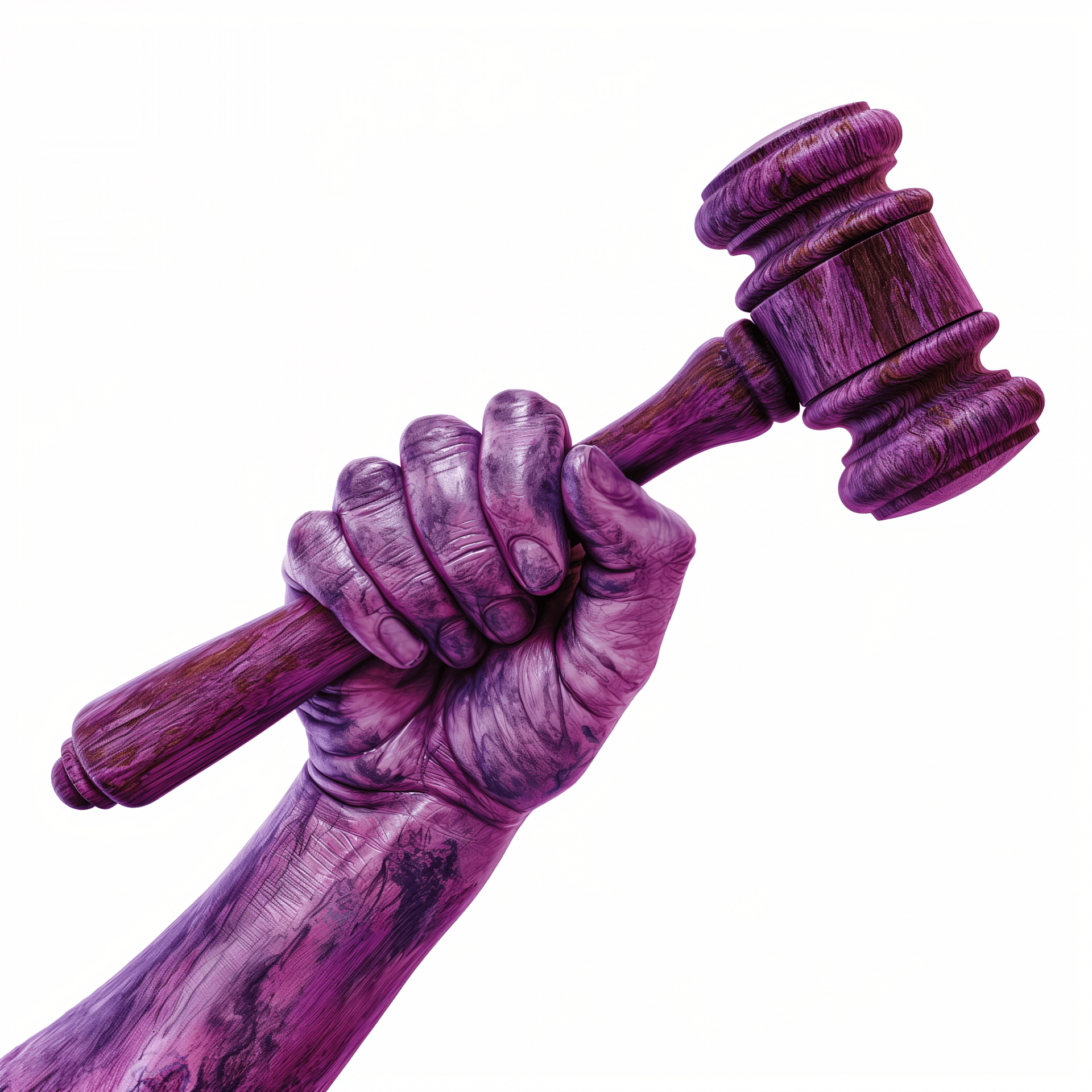 This image features a remarkable hand gripping an auctioneer's gavel, emphasizing intricate details. The vibrant purple color contrasts beautifully with the clean white background, creating a striking visual impact.