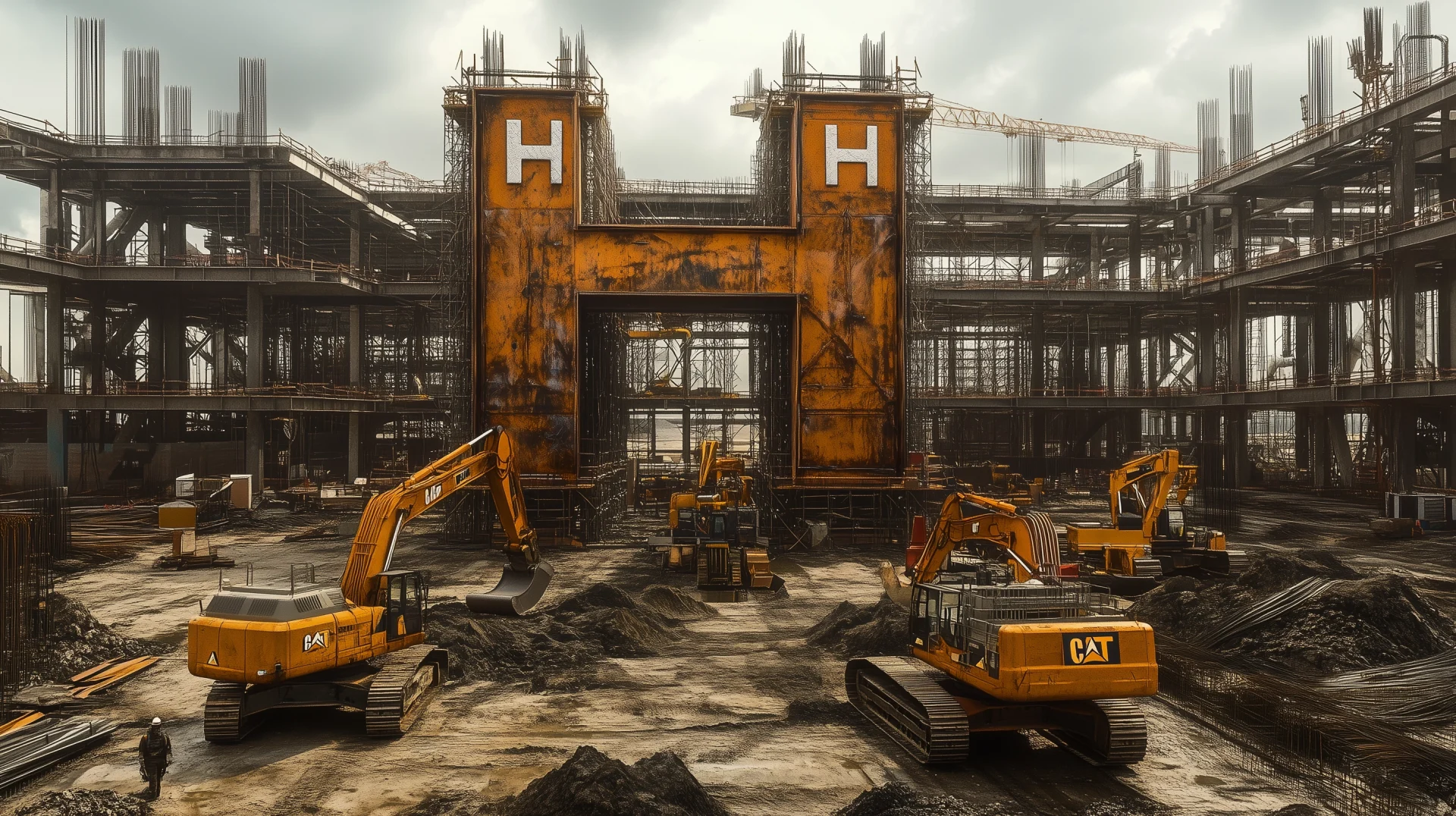 The image depicts a bustling quarry site filled with large excavators working on the rocky terrain. In the backdrop, towering rock formations loom over the equipment, creating a dramatic and industrial atmosphere.