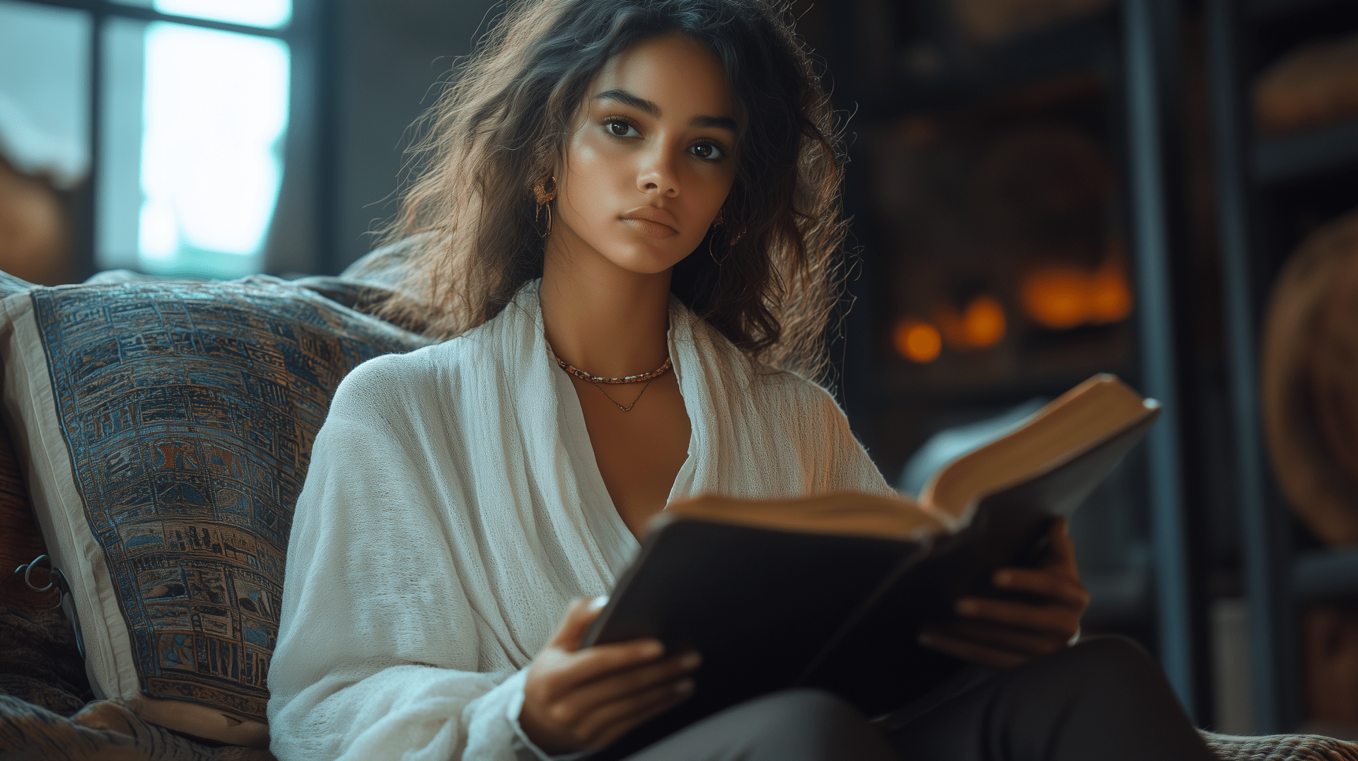 A thoughtful woman is seated on her bed, immersed in the glow of dim lighting as she peruses ancient texts. The atmosphere is calm and studious, creating an intimate setting that highlights her concentration.