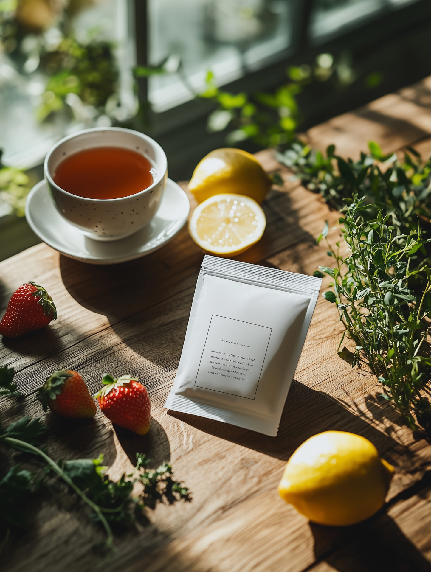 The image showcases a wellness tea pouch elegantly placed on a smooth wooden table. Surrounding it are fresh herbs, slices of strawberry and lemon, as well as a ceramic cup of tea, creating a calming and inviting atmosphere.