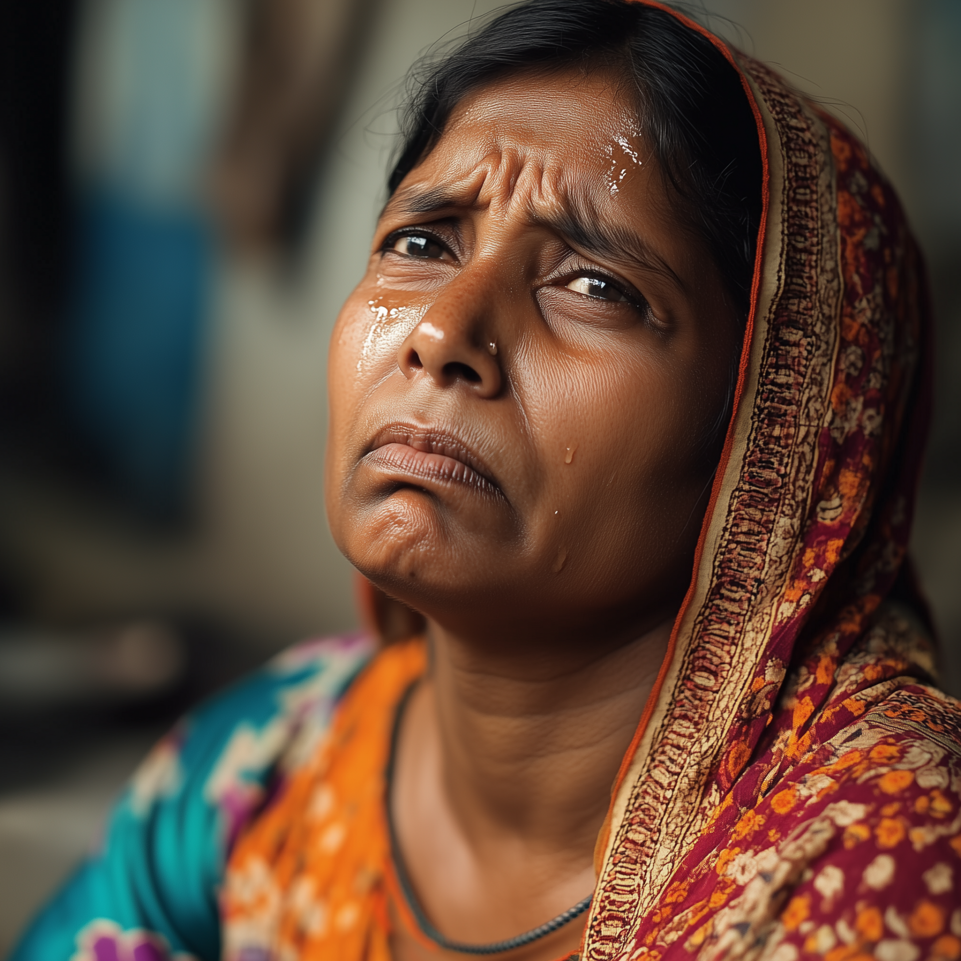 A Bangladeshi Hindu woman sits alone, tears in her eyes. She wears a bright traditional saree, showcasing intricate designs, while her sad expression captures her emotional turmoil.