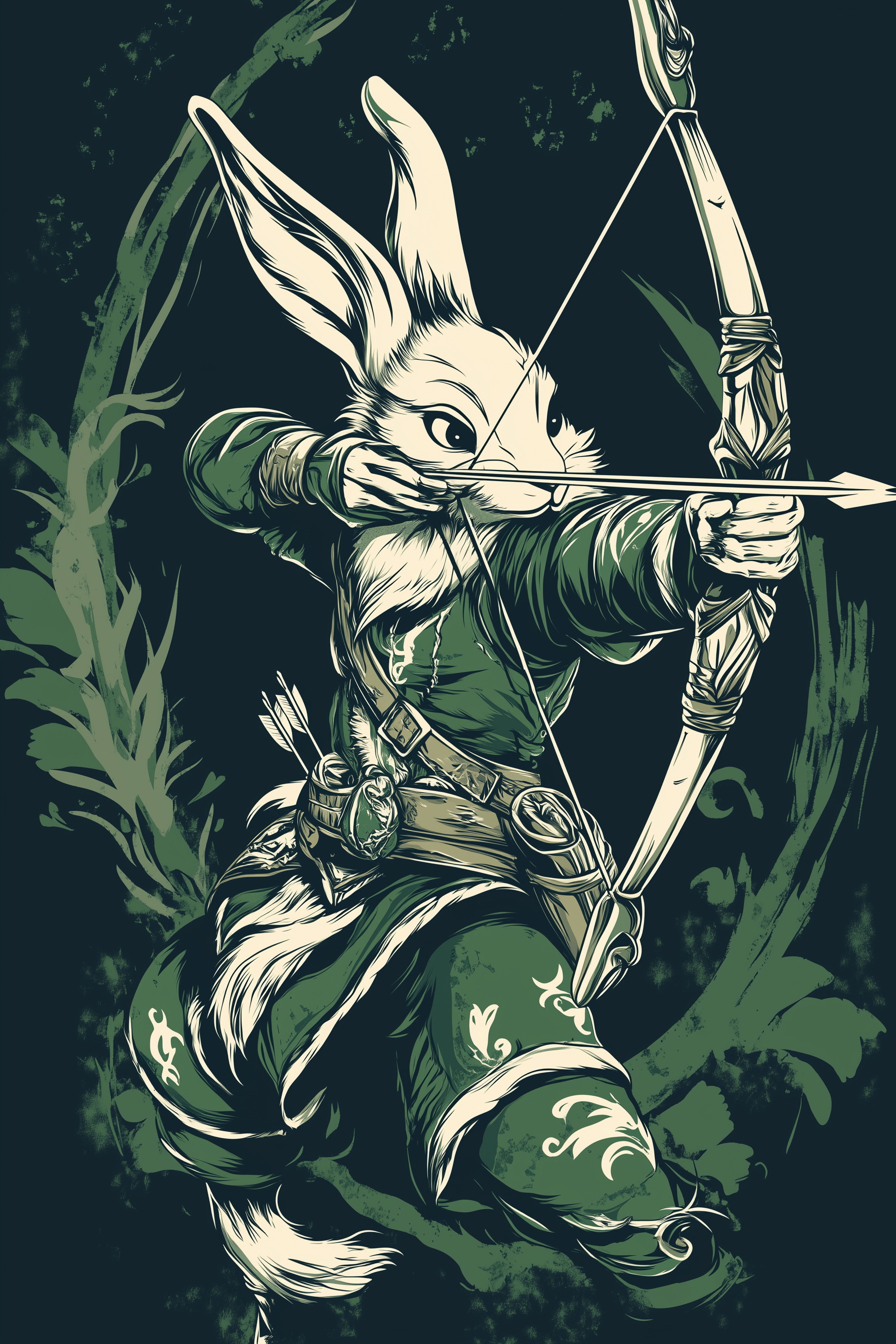 The image depicts a majestic rabbit archer dressed in a combination of green and white attire, poised to take aim with a bow. The illustration captures a dynamic and adventurous essence, blending a sense of pride with the thrill of archery.