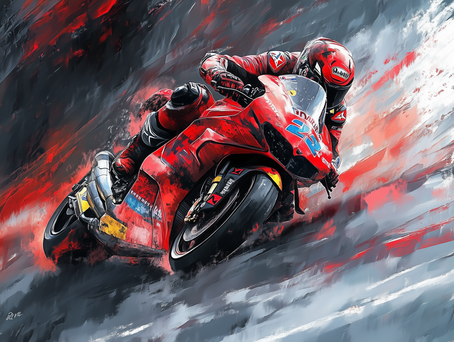 This dynamic illustration showcases a highly detailed red MotoGP bike leaning into a turn, exuding a sense of motion and speed. Set against an anthracite background, the artwork captures the essence of racing with vibrant colors and fluid lines.