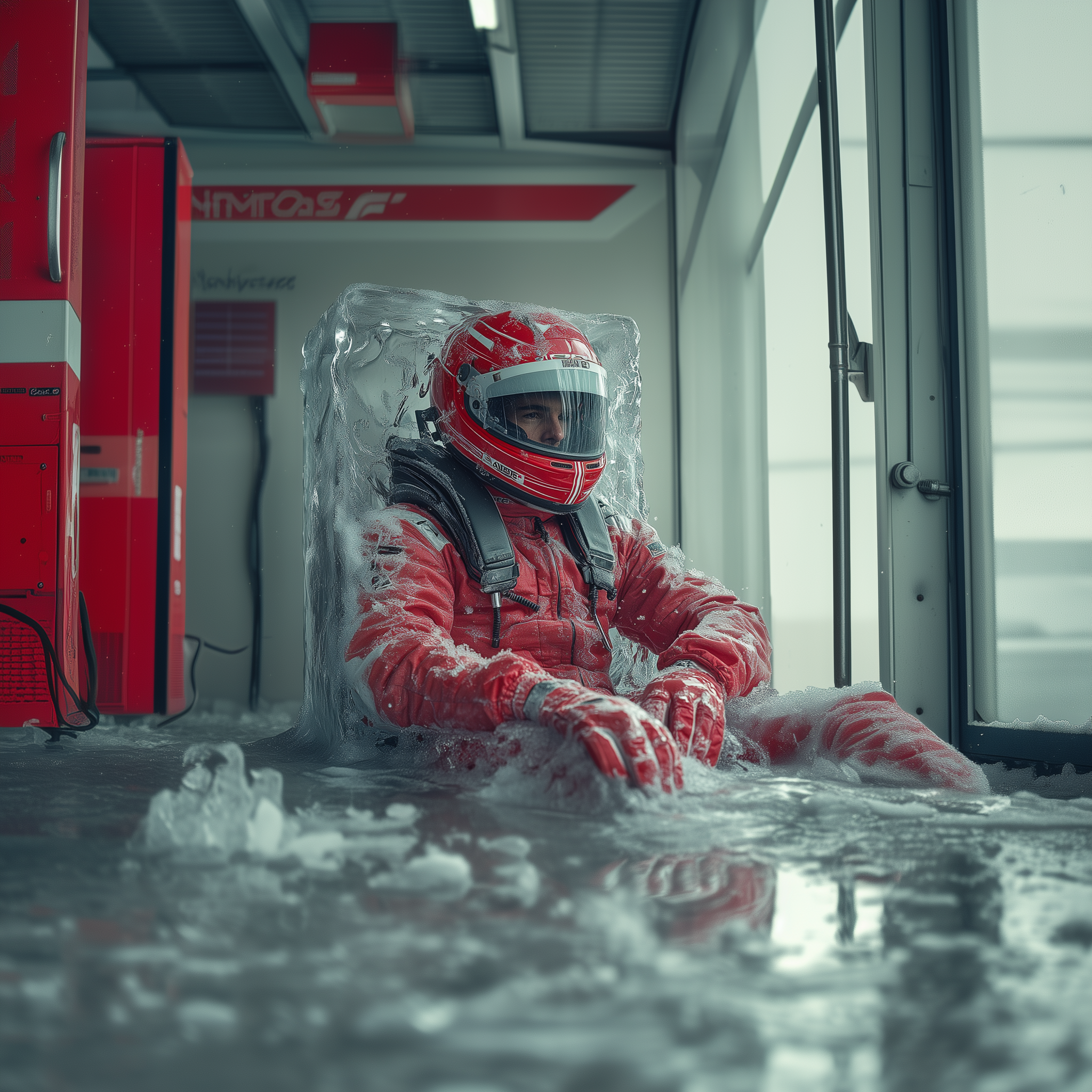 A surreal and captivating image featuring a Formula One driver sitting inside an ice cube. The photo showcases a visually striking contrast between the sleek racing attire of the driver and the frozen, crystalline textures of the ice cube.