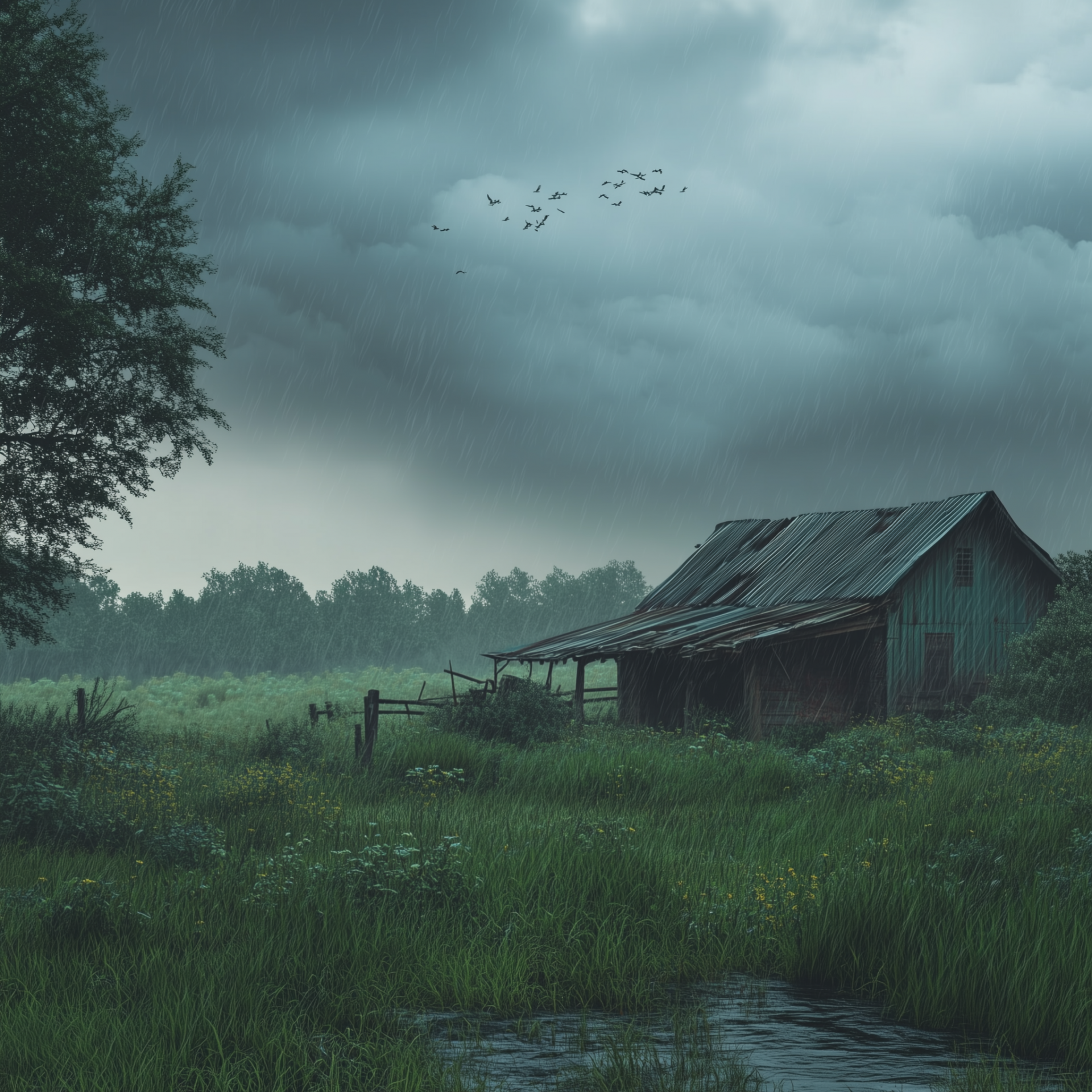 The image captures a moody summer day, with dark clouds looming overhead. Raindrops can be seen falling, creating a sense of tranquility and reflection in the scene.