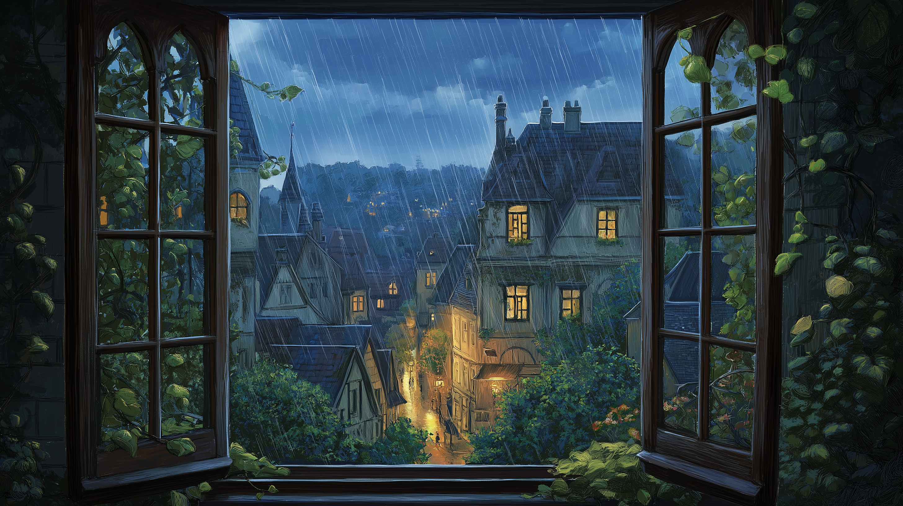 The image presents a warm and inviting view of a rainy cityscape through a third-floor window. Soft light from street lamps illuminates the lush greenery that envelops the charming old architecture, creating a tranquil atmosphere.