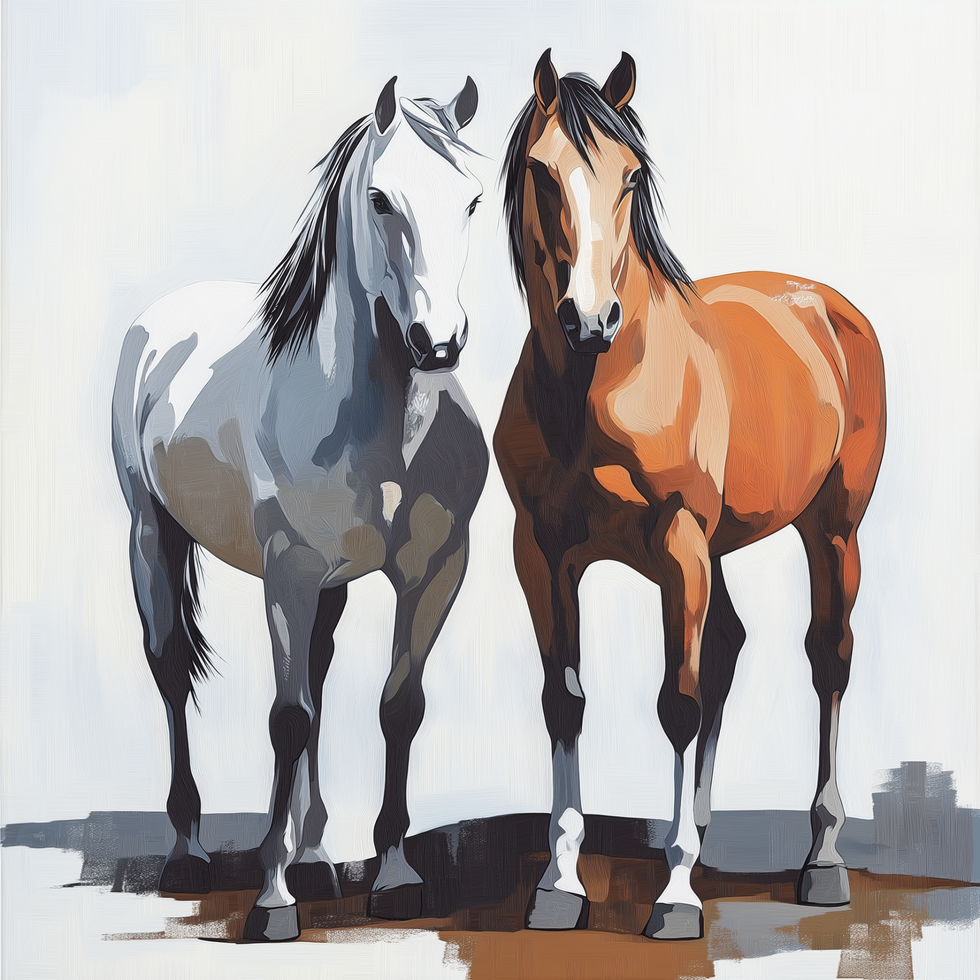 The image features two horses standing side by side, rendered in bold block colors. The shading creates a striking abstract effect, evoking a sense of creativity and movement.