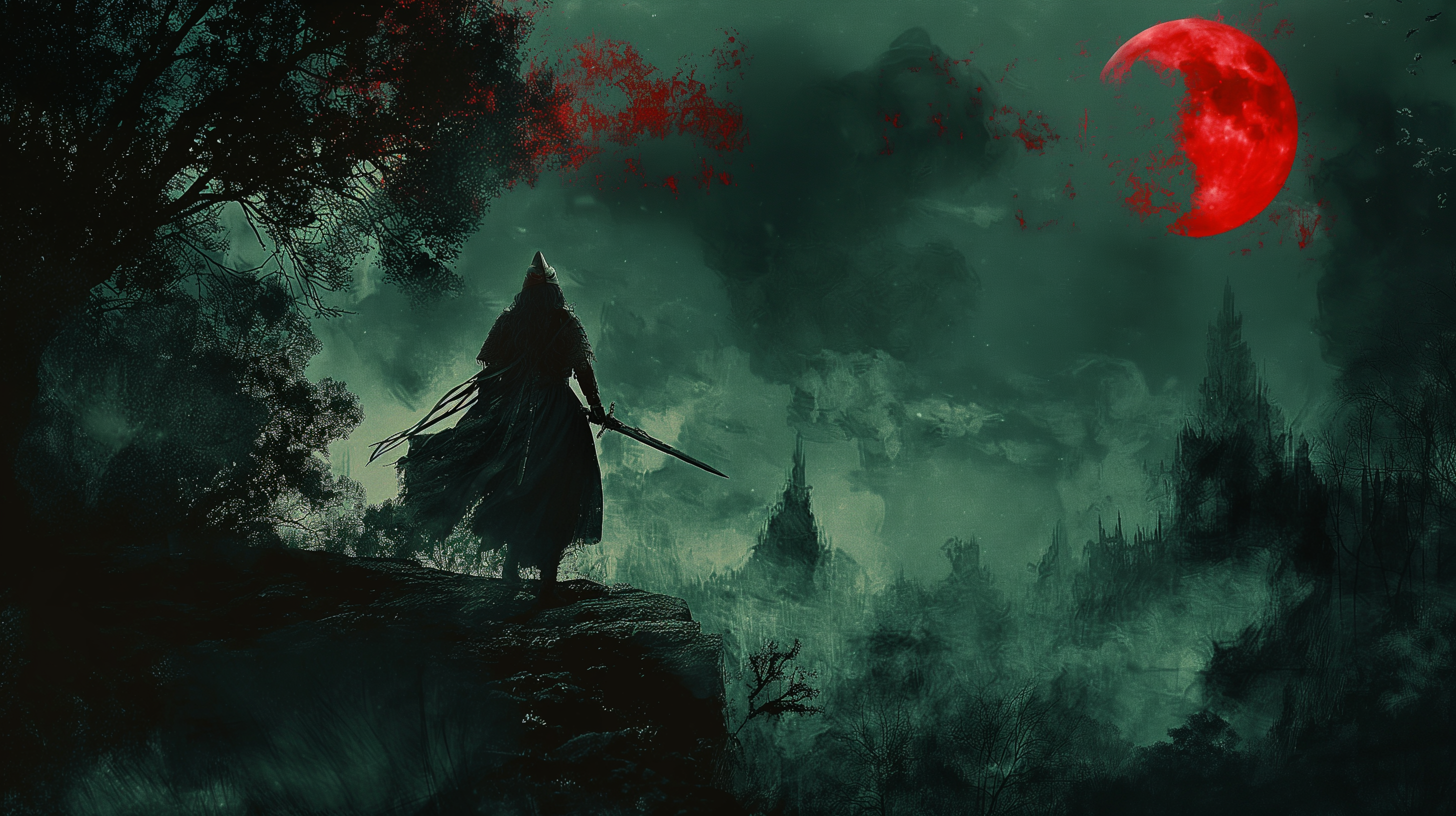 A dark and mysterious lithograph depicting an enchanting female knight in a gothic and fantasy setting. The scene is illuminated by a red moon against a dark background.