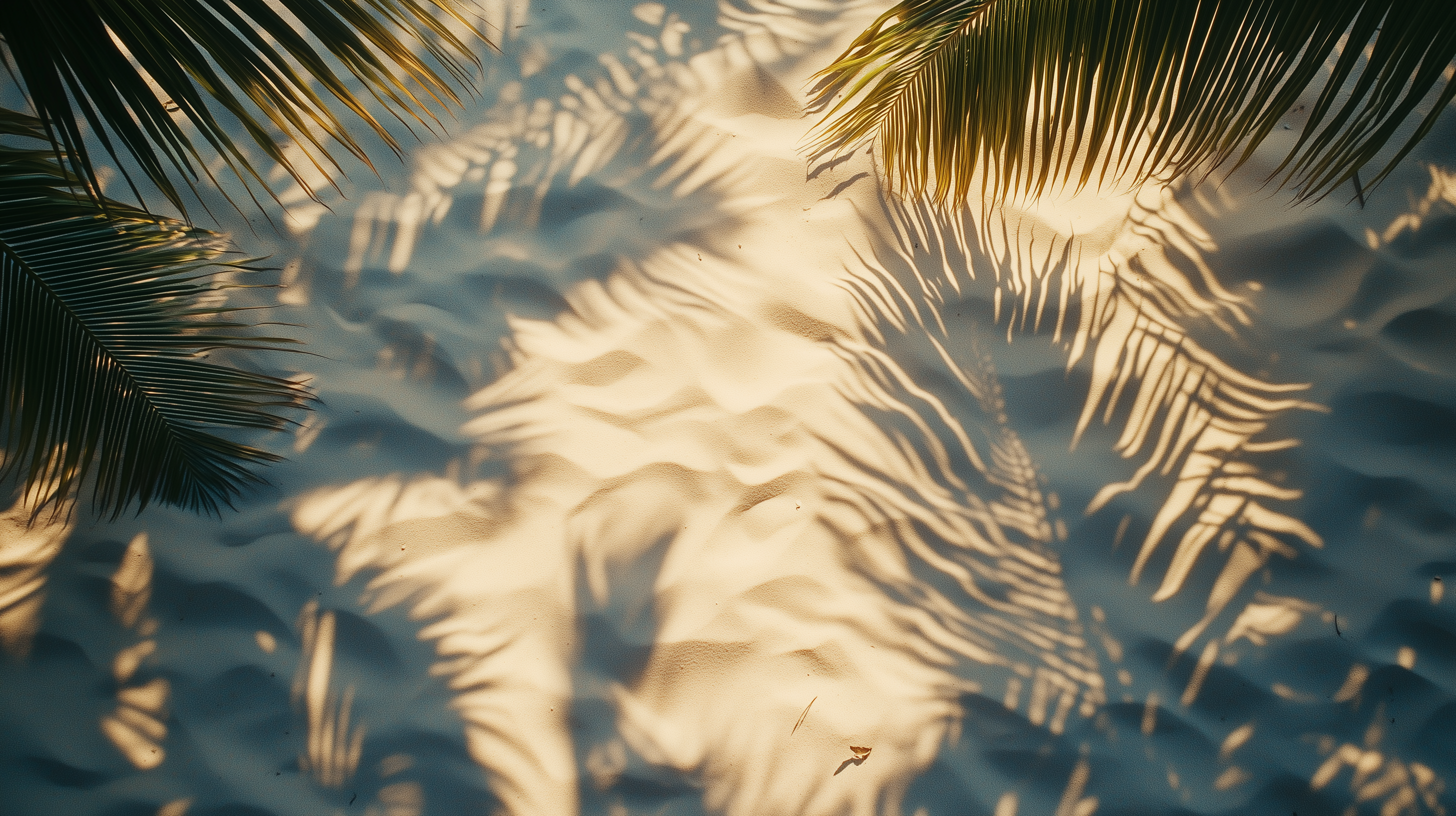 This image captures a serene top view of soft beach sand adorned with the intricate shadows of palm leaves. The overall effect evokes a sense of relaxation and a tropical getaway.