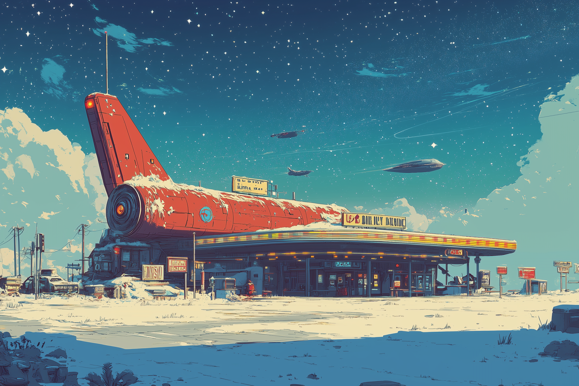 This illustration captures a vibrant street view inspired by the retro anime style of the 1950s. The scene is filled with colorful buildings, unique vehicles, and a nostalgic atmosphere that transports the viewer back in time.