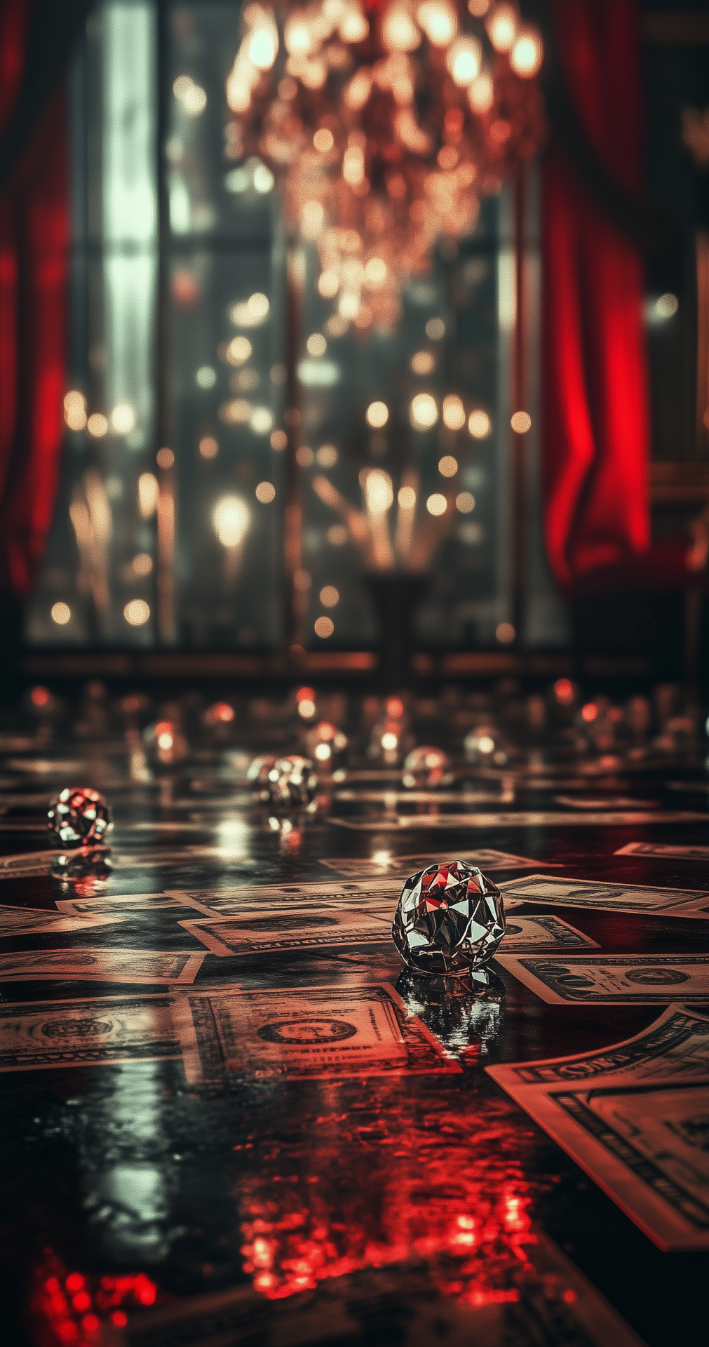 The image captures a luxurious scene featuring diamonds and stacks of money scattered on a polished floor. In the background, a vibrant city skyline enhances the opulent atmosphere with sharp details and a striking focus.