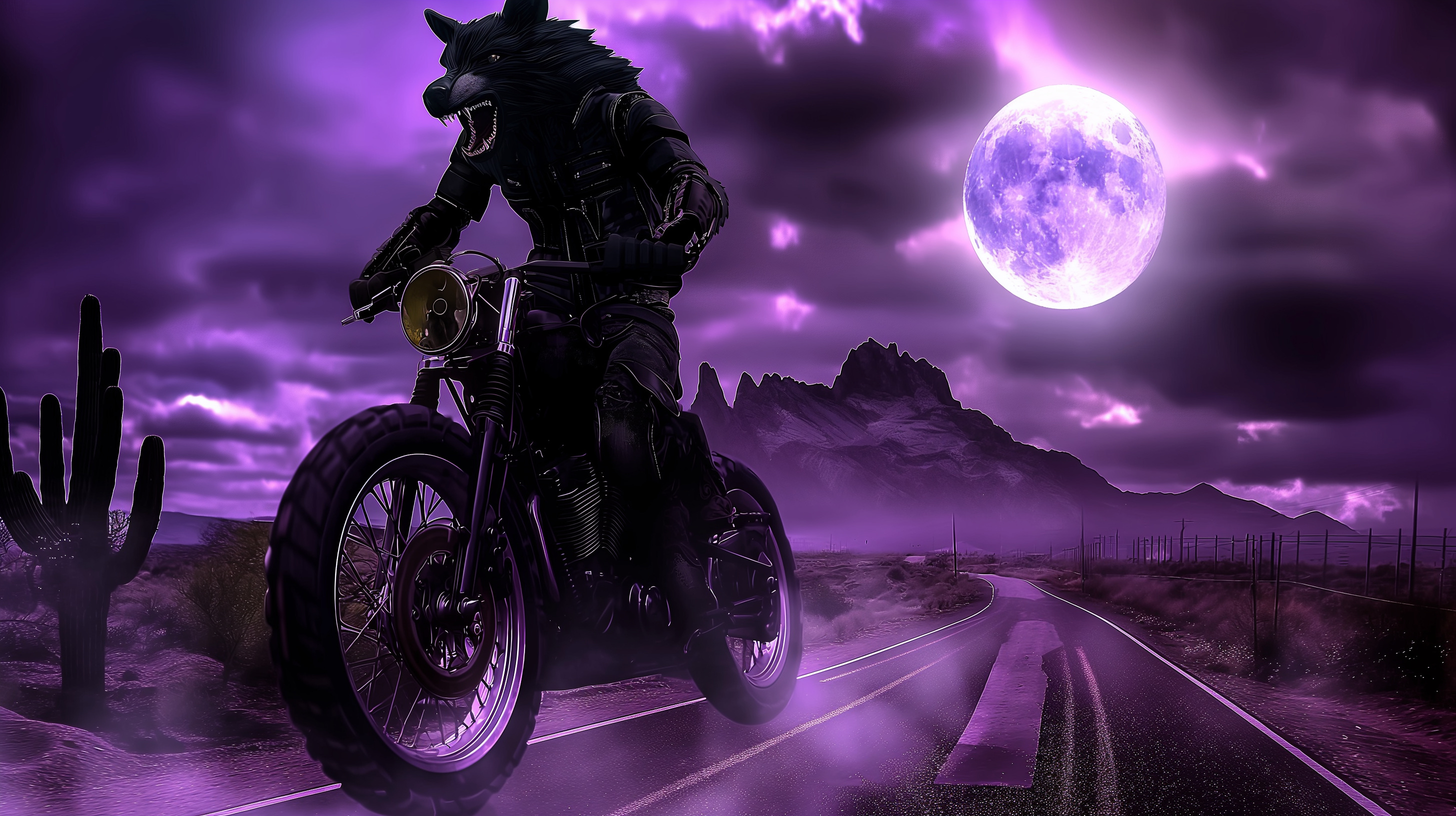 An edgy and thrilling illustration of a werewolf with biker attire riding a motorcycle while performing a daring wheelie maneuver.