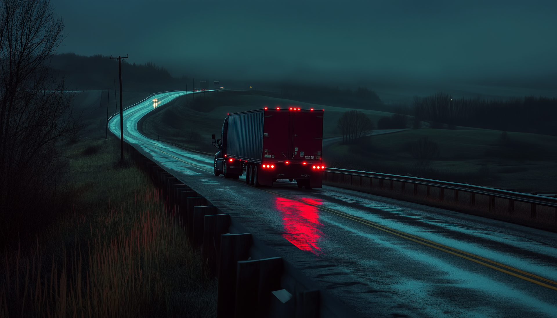 The image captures a semi truck driving down an expansive highway under a clear blue sky. The truck is highlighted against a backdrop of distant mountains, conveying a sense of freedom and travel.