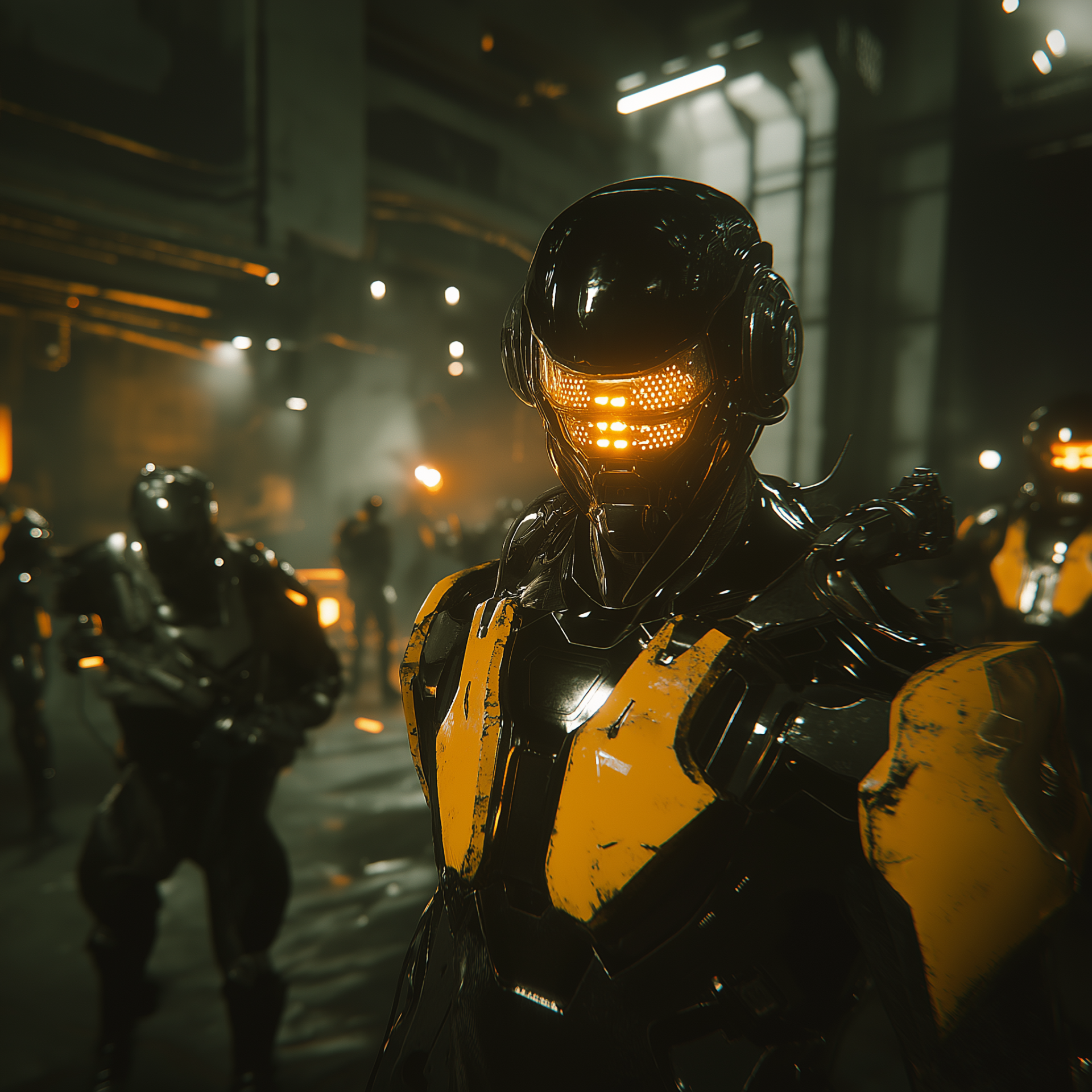 This illustration showcases a dark and intense battle scene characterized by evil robotic military forces. The vibrant black and yellow colors enhance the hyper-realistic style, evoking a feeling of chaos and conflict in a dystopian world.