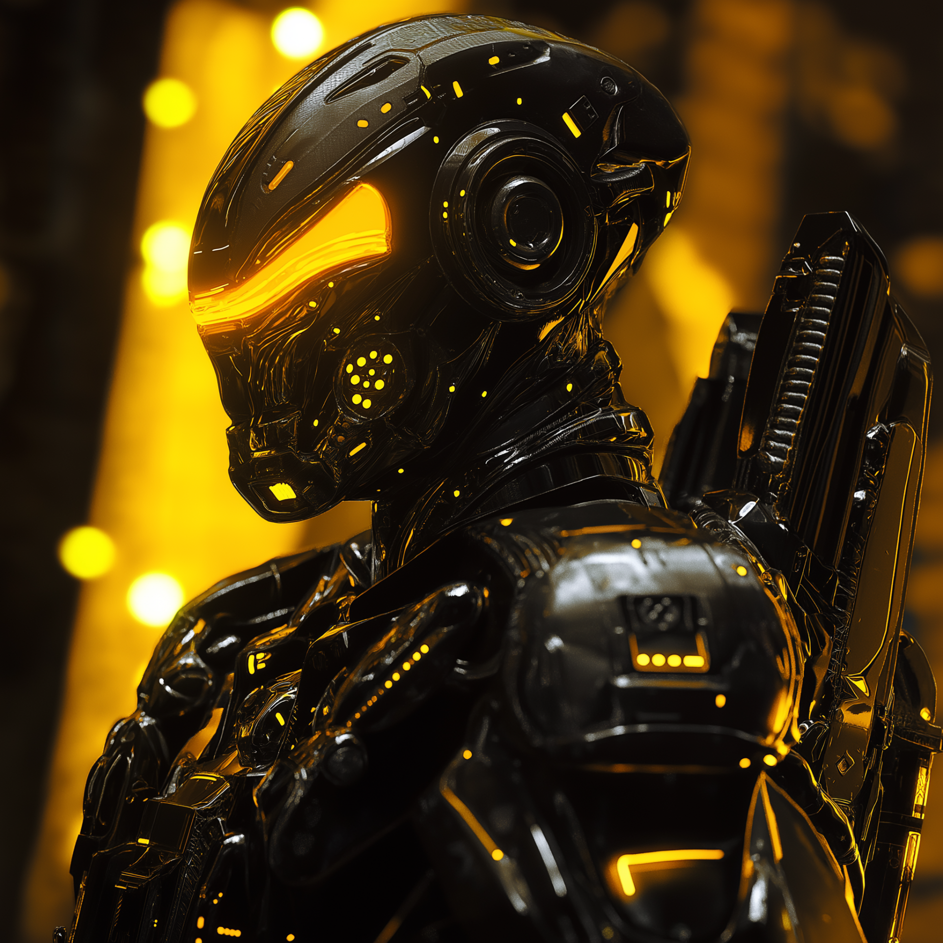 This illustration depicts a dystopian battle scene filled with hyper-realistic robotic warriors amidst explosions and chaos. The colors are predominantly black and yellow, creating a vivid and intense atmosphere reminiscent of classic comic styles.