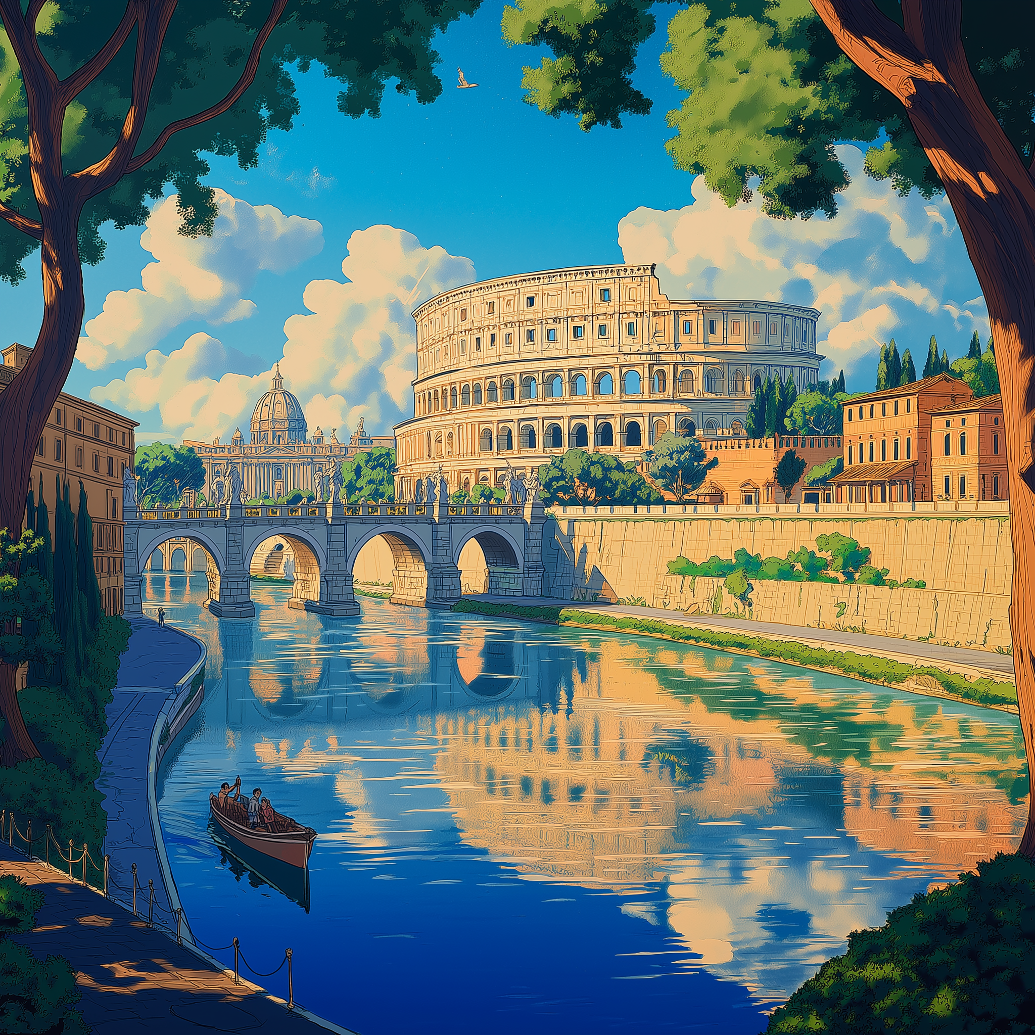 This illustration captures the essence of Rome with vibrant colors and a whimsical atmosphere. The iconic elements of the Colosseum, St Peter’s Cathedral’s dome, and the Tiber River are beautifully rendered in a style reminiscent of classic animation.