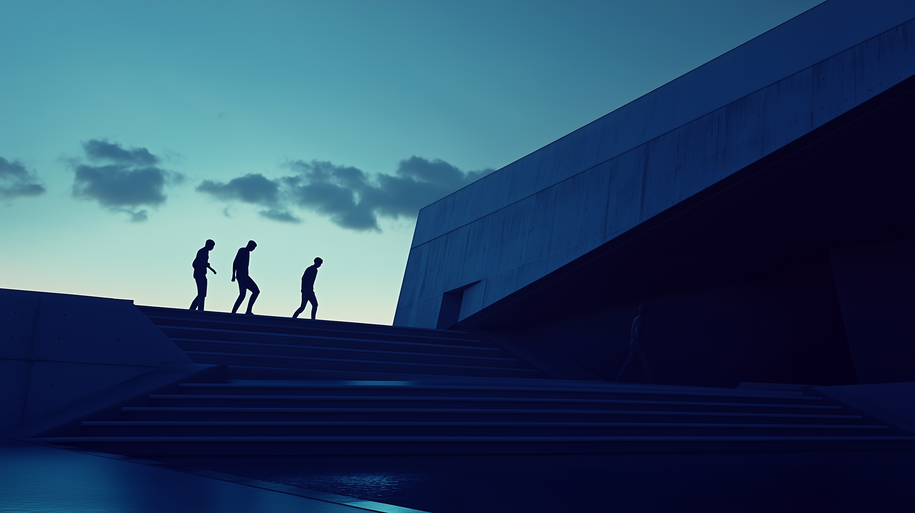 The image depicts three individuals stealthily navigating the rooftop of a museum inspired by unique architectural styles. The night setting adds a cinematic feel, with dramatic shadows and highlights enhancing the mood.