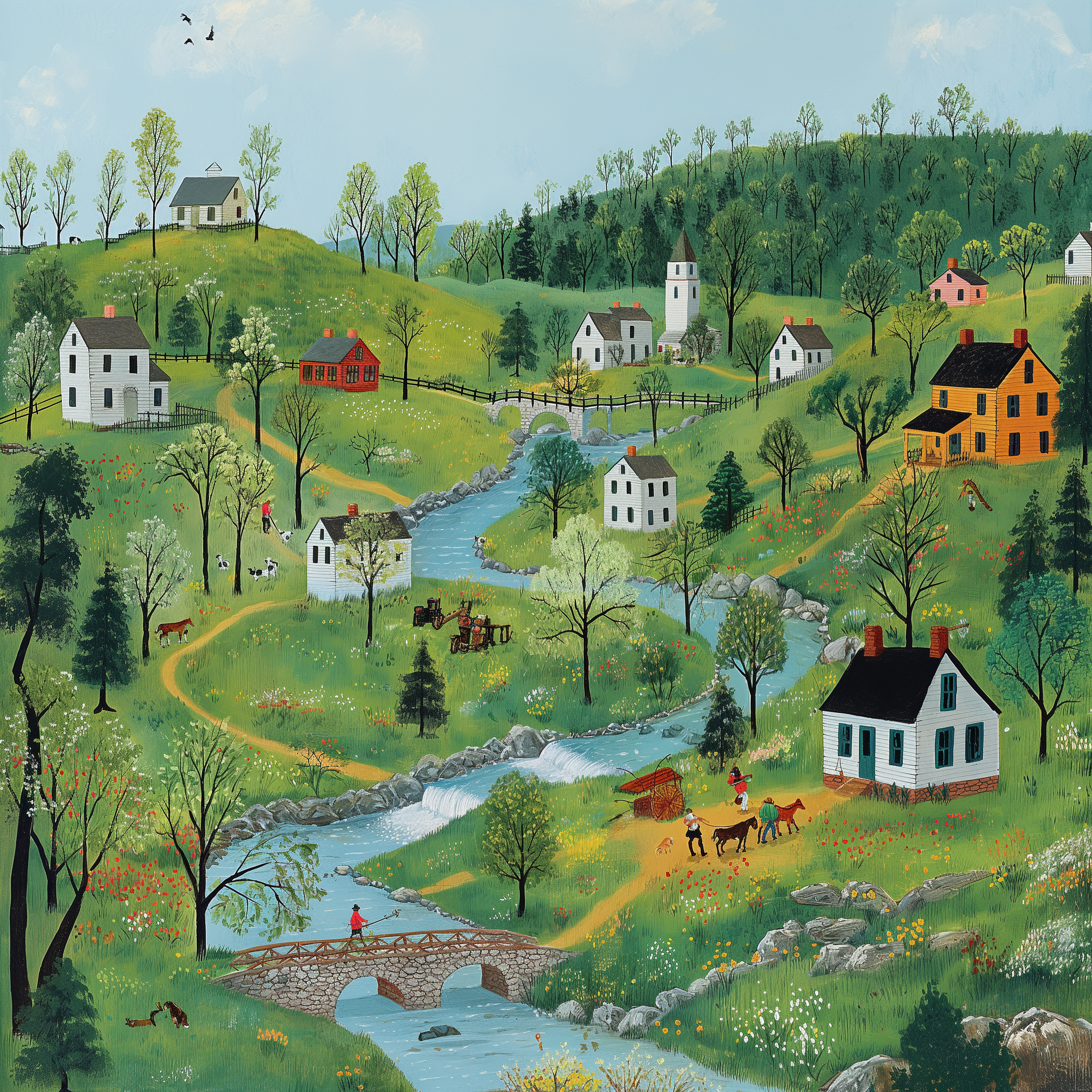 The image showcases a serene countryside scene, painted in a naive art style using soft watercolors. It evokes nostalgia with colorful landscapes featuring fields, houses, and people engaged in various rural activities surrounded by nature.