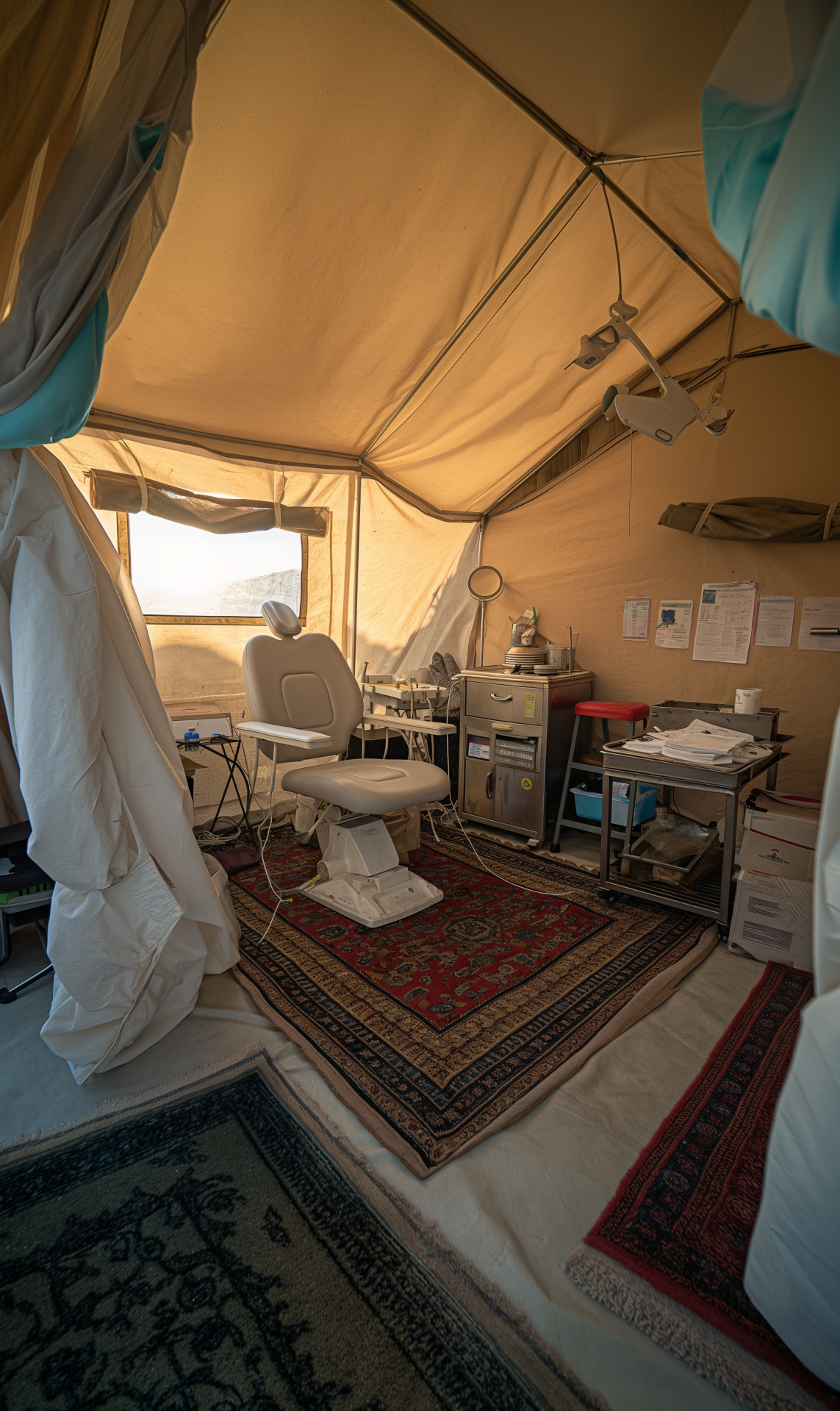 The image portrays a neat and organized dental camp inside a field tent, with sunlight softly filtering through the fabric. It showcases a functional dental setup that evokes a sense of care and community in a rural atmosphere.