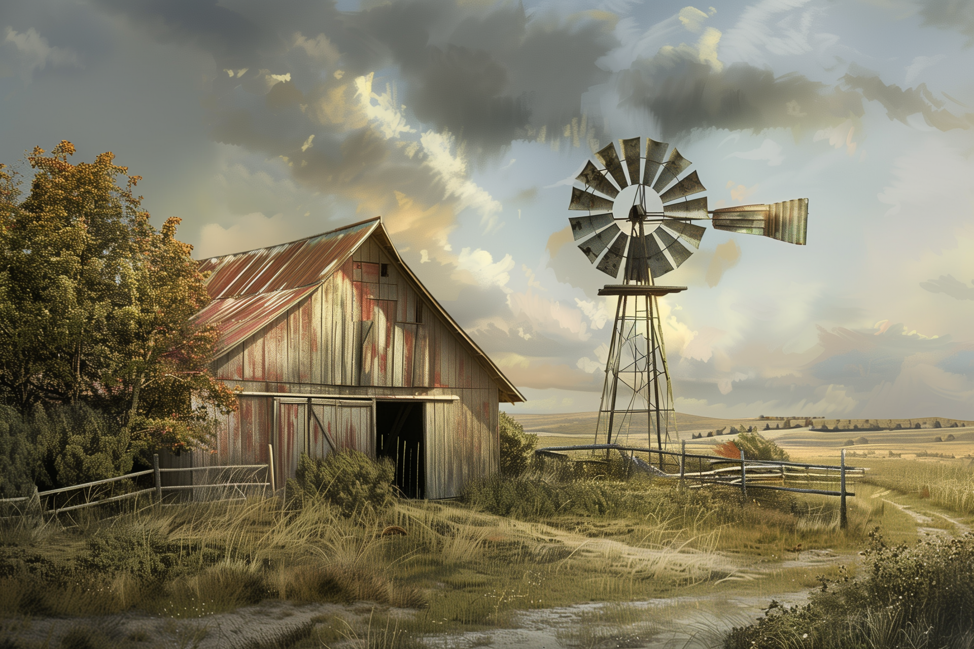 The image depicts a charming barn set against a backdrop of a rustic ranch, complete with a classic metal windmill. The style is shabby chic, featuring soft colors and a whimsical appearance that evokes a sense of tranquility and nostalgia.