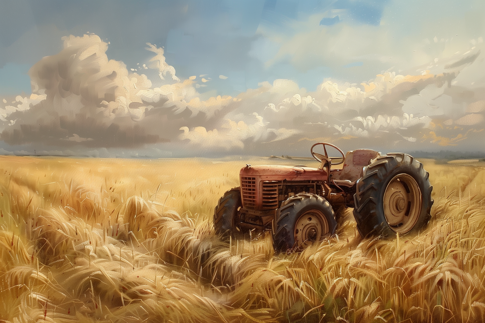 The image features a vintage farm tractor sitting amidst a golden field of ripe wheat. The artwork captures a charming and nostalgic atmosphere, evoking a sense of rustic simplicity.