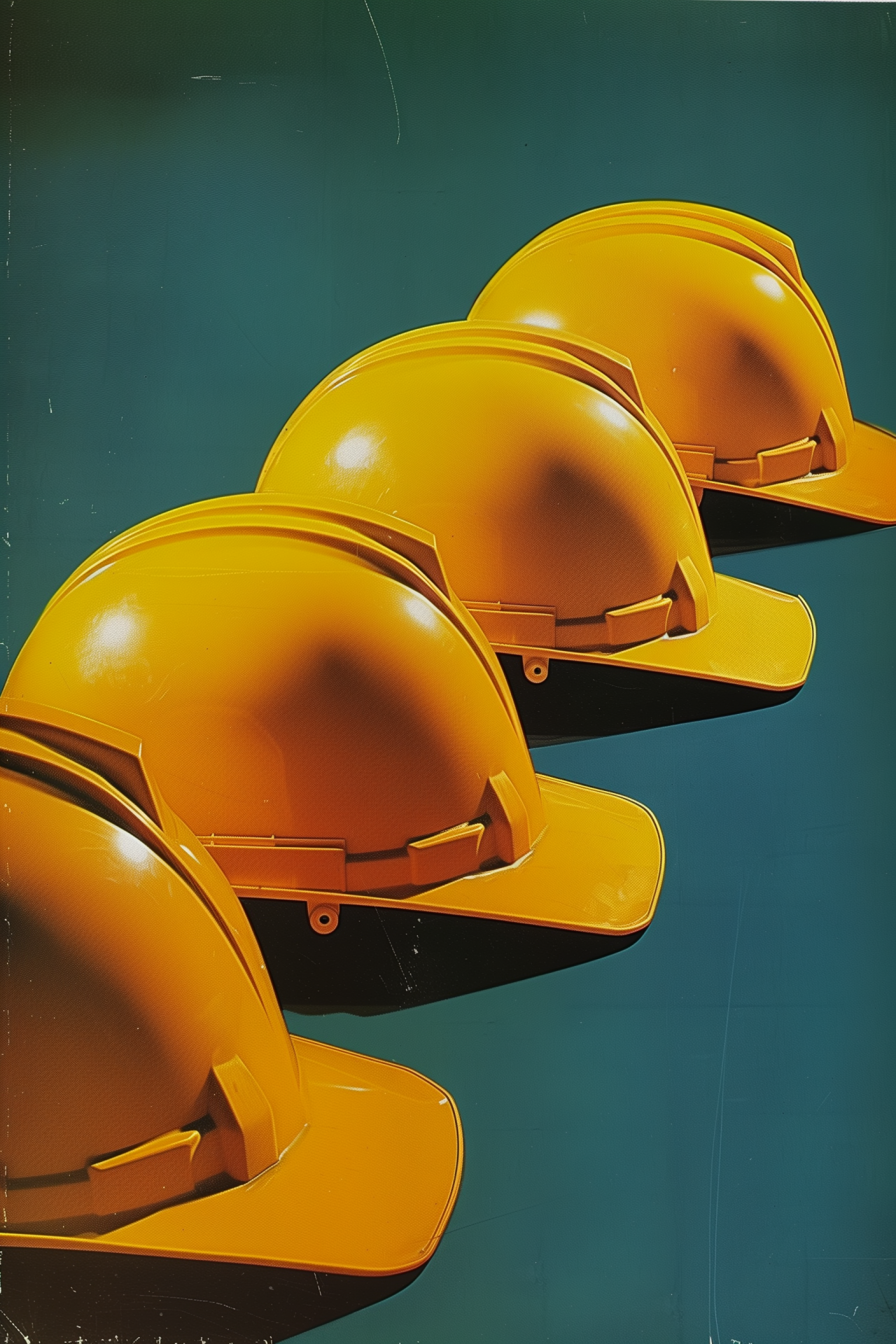 This image features a vibrant yellow safety helmet showcased in a retro magazine advertisement from the 1960s. The riso print style adds a textured look, evoking a sense of nostalgia and vintage charm.