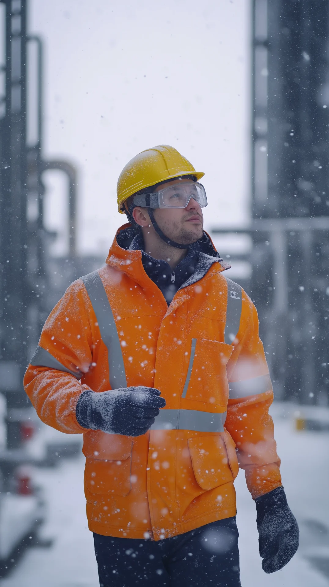 The image showcases a young contractor dressed in full personal protective equipment, exuding a sense of professionalism and safety. The bright colors of the safety gear contrast with the construction environment, highlighting the importance of worker safety.