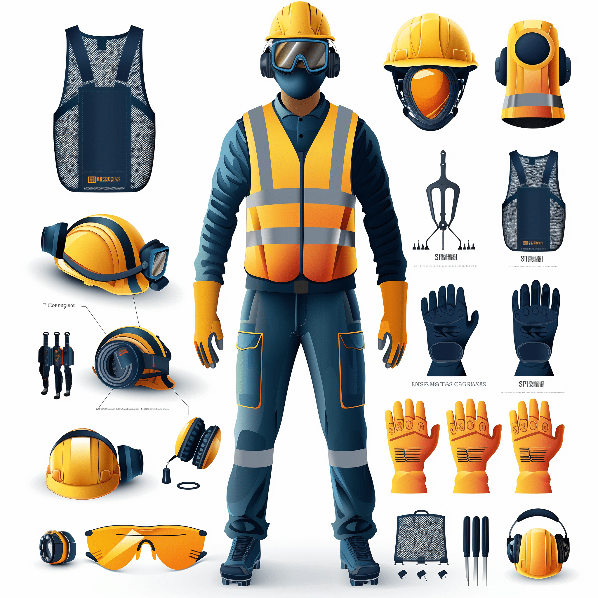 The image features a detailed illustration of a construction worker dressed in full personal protective equipment. The worker is wearing a bright yellow hard hat, protective goggles, and ear protection, conveying a sense of safety and professionalism.